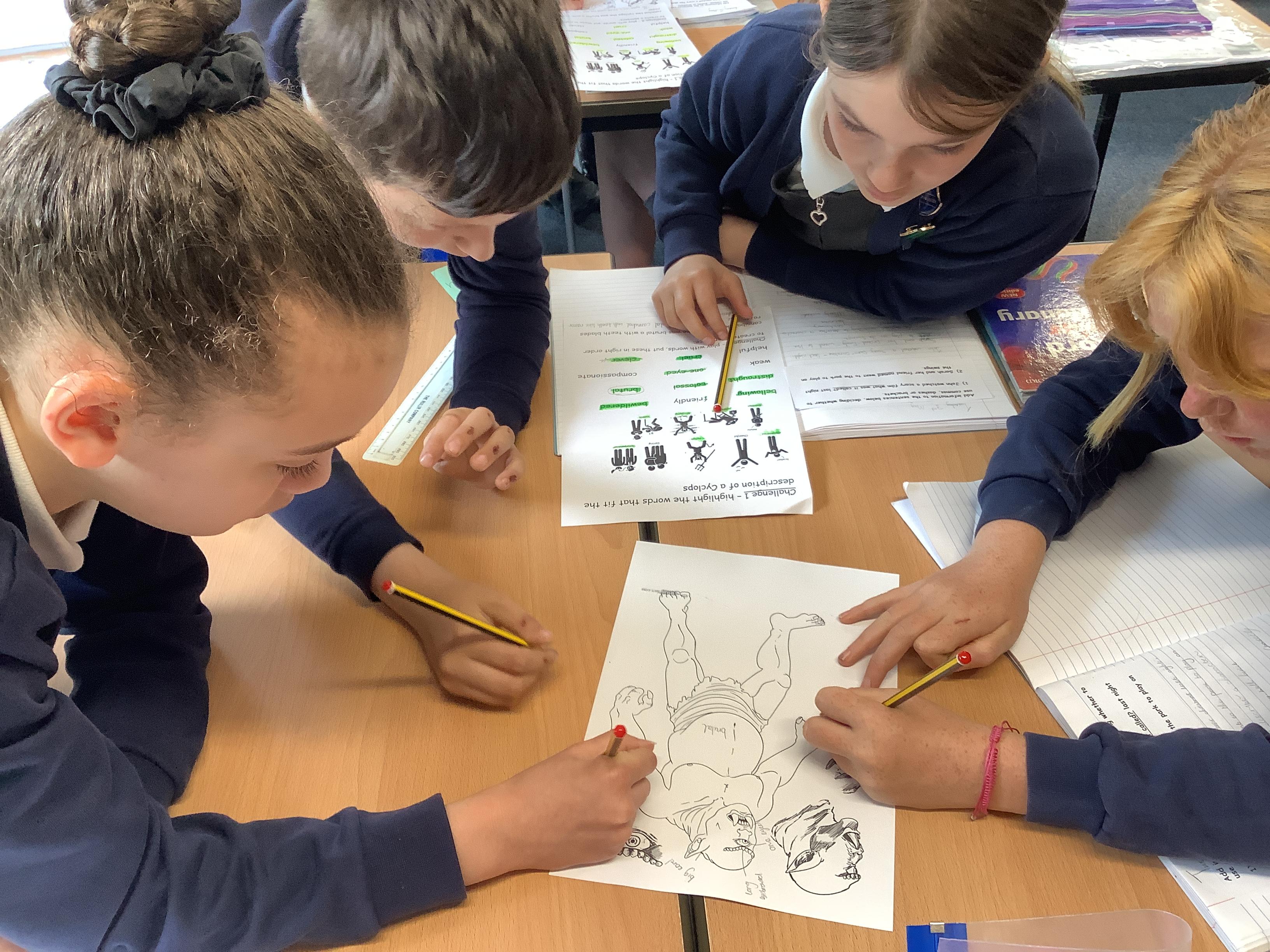We had lots of fun exploring vocabulary that describes the Cyclops in The Odyssey, our text this term. We identified words that matched him first, then researched synonyms in thesauruses. We looked up definitions in the dictionary and finally put all that super vocabulary to good effect, using it to describe his physical appearance and his personality.