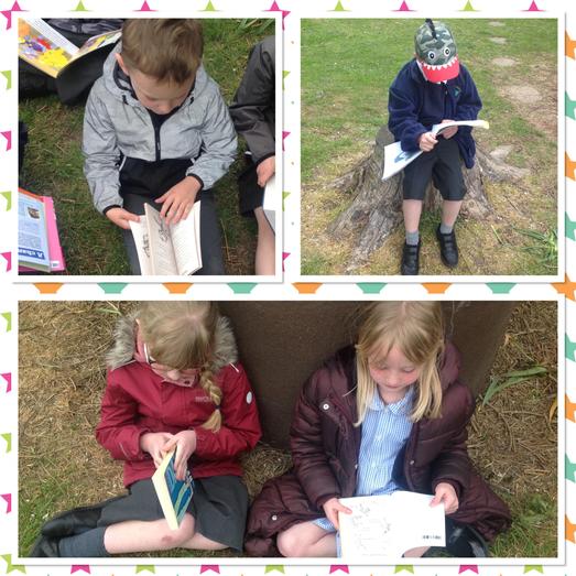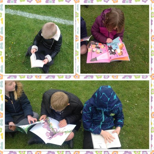 Today the children all had a wonderful time choosing a new book to read from our library and then taking it outside and sharing their book with friends on the field.