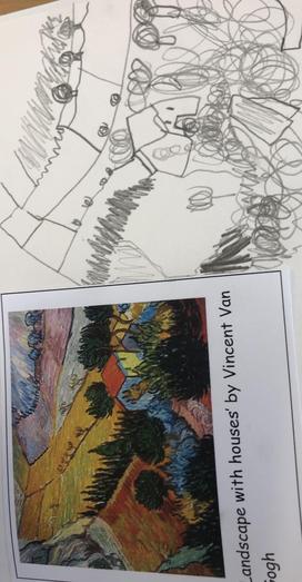 This week we have been looking at the Floris by Bernard Cohen and Landscape with Houses by Vincent van Gogh. We talked about how lines have been used in each drawing? Space? How texture has been created? We then tried to sketch our own versions.