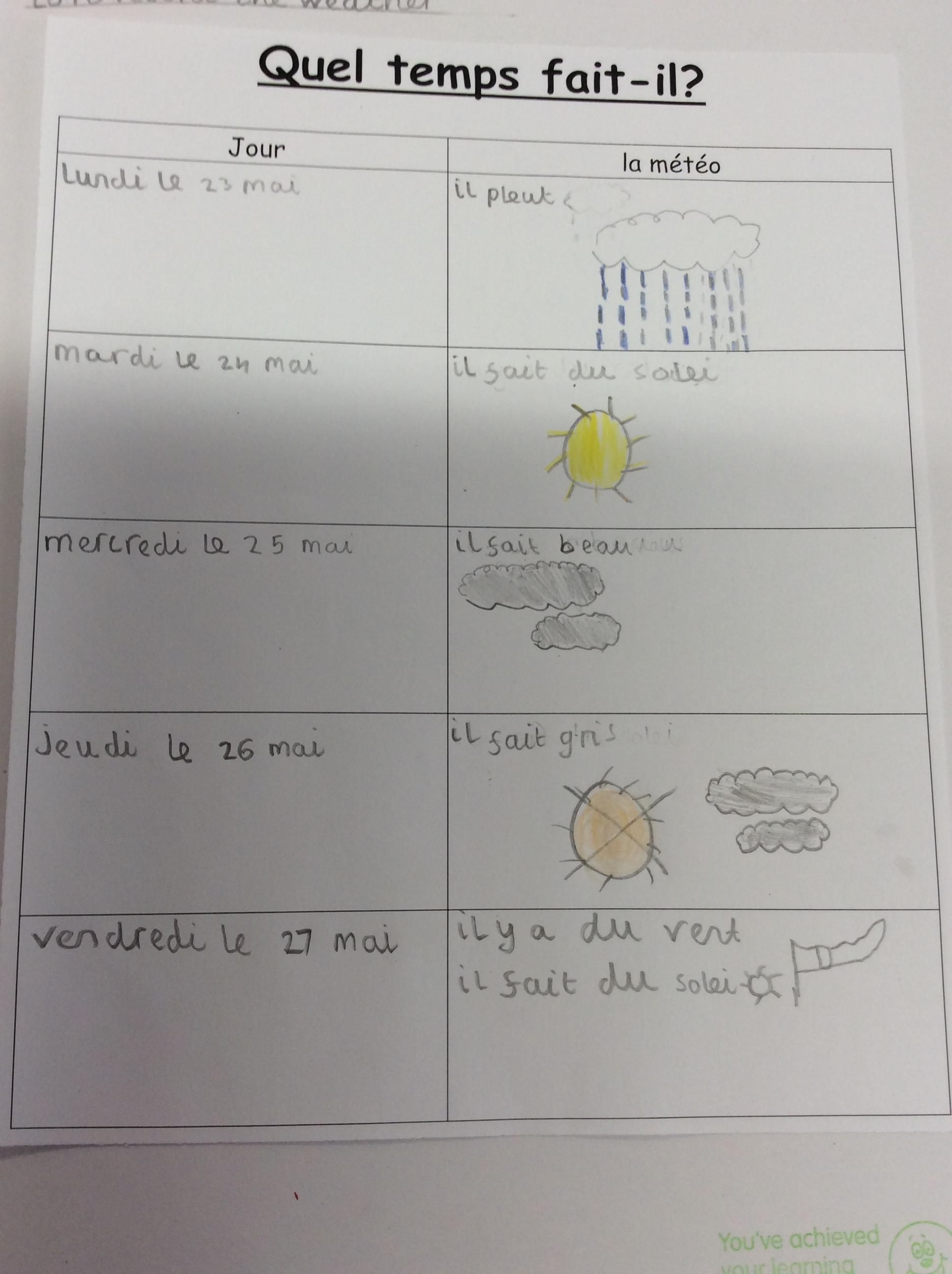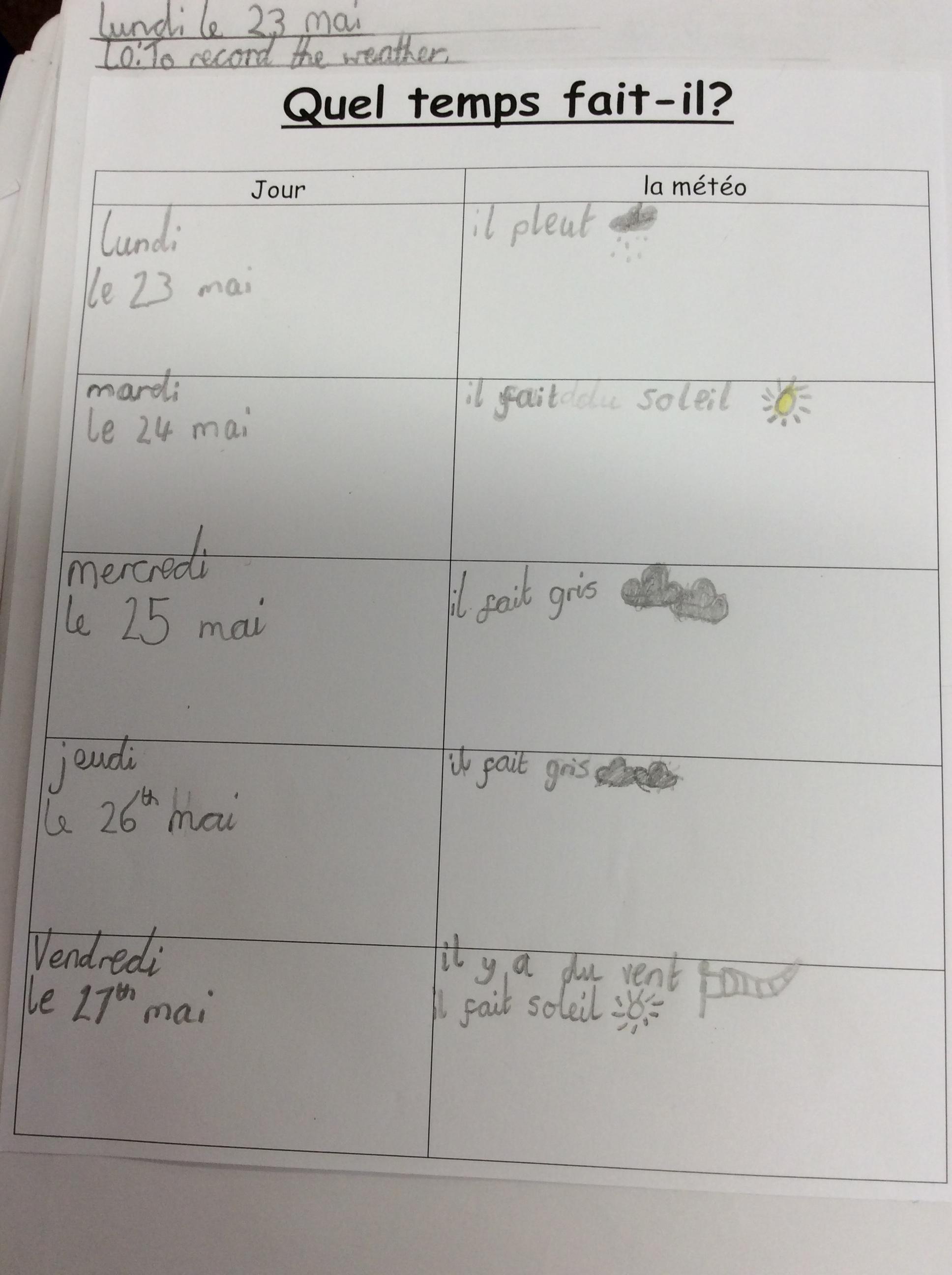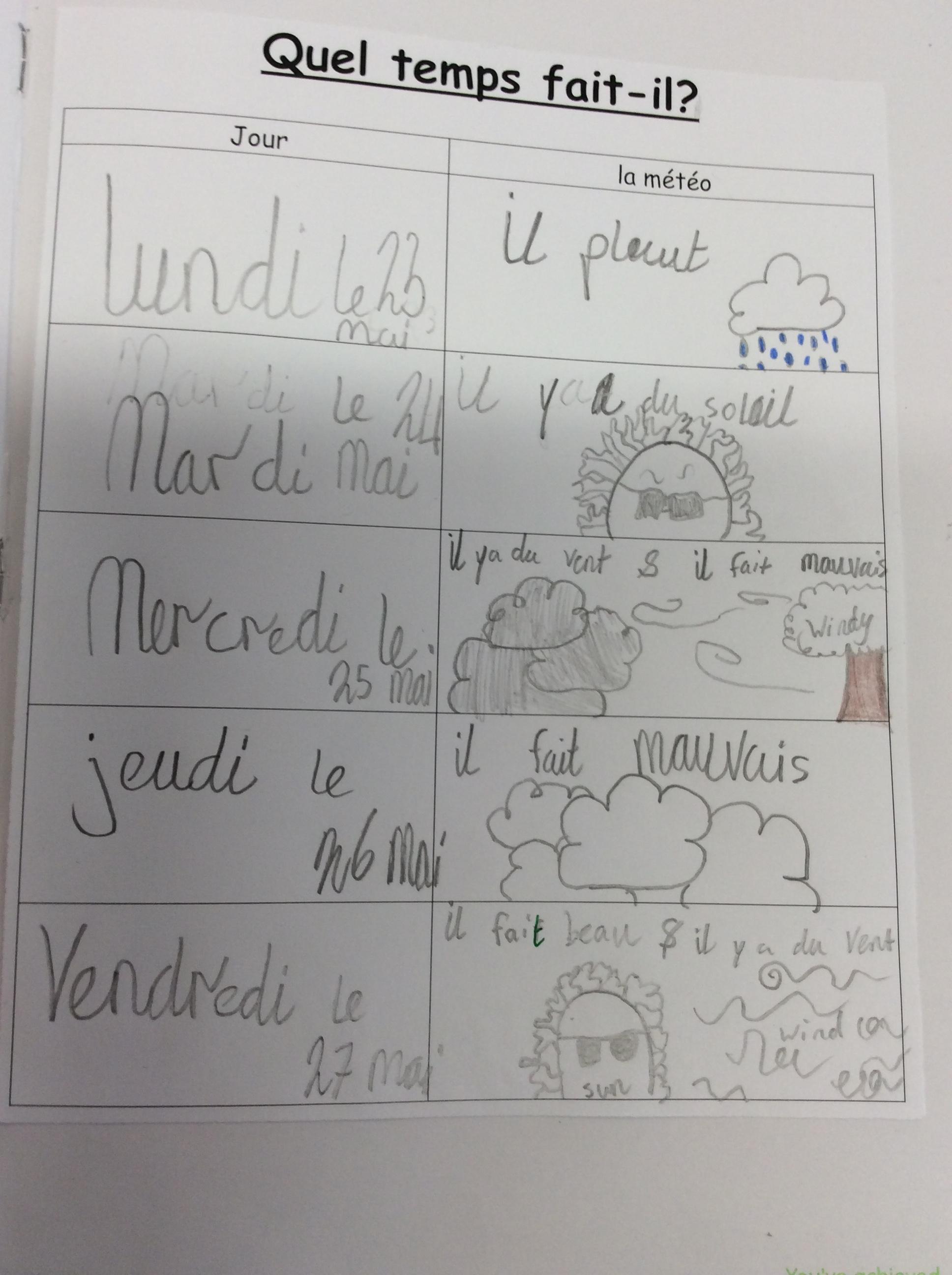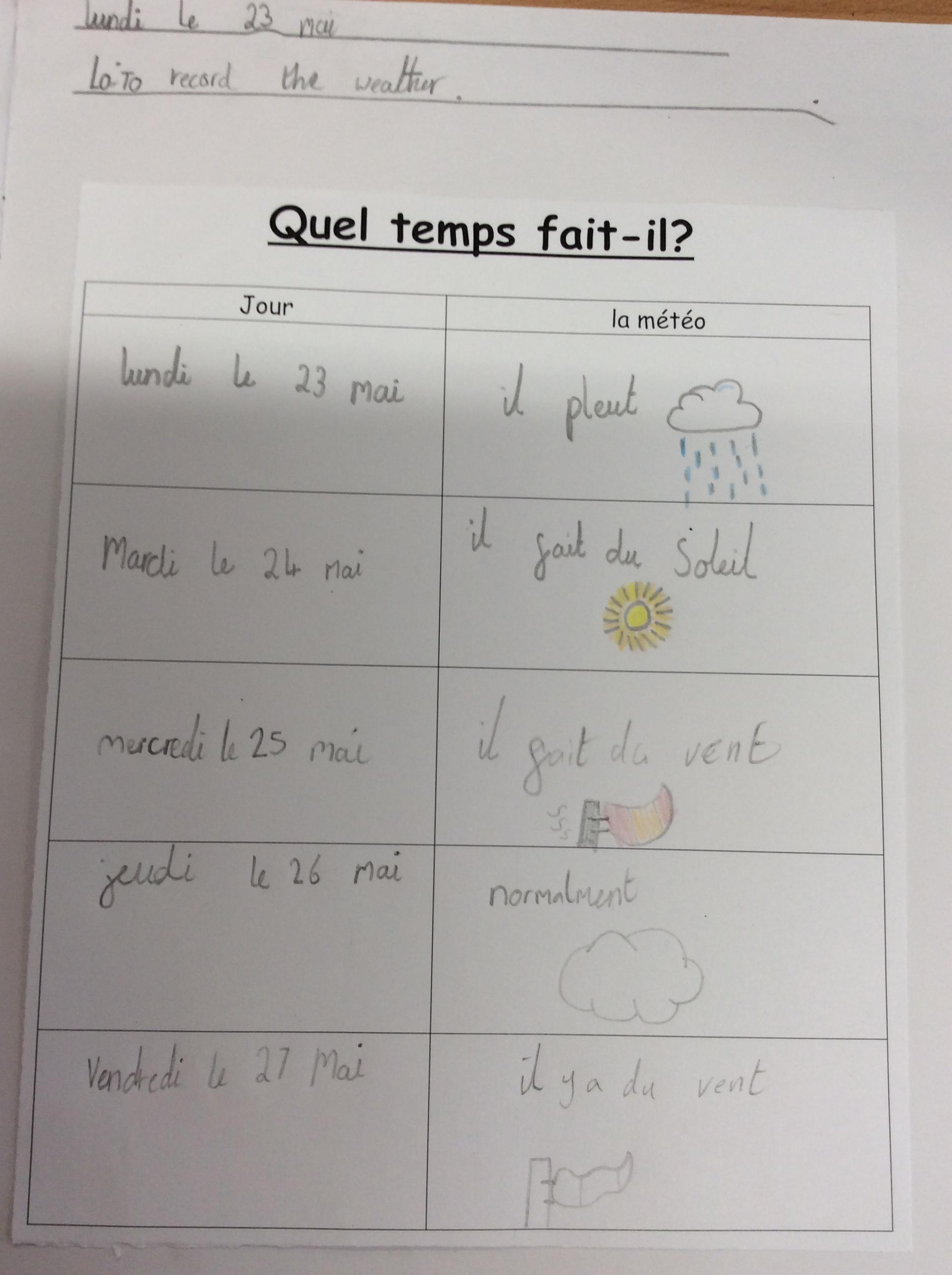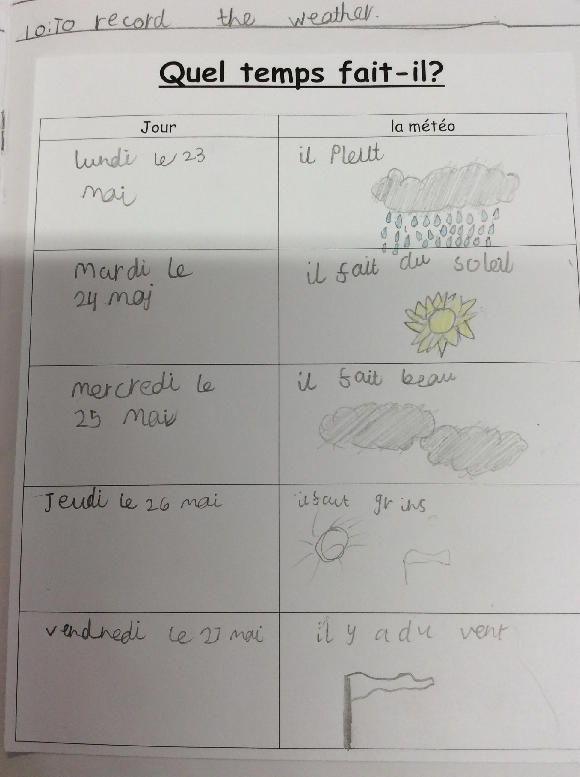 This term in French we have been asking and answering questions about the weather. We named the different types of weather in French, spoke about the weather we like and dislike, answered true and false questions and located cities and their weather on maps. For our final week of term we are keeping a weather diary, asking ourselves the question each day, 'Quel temps fait-il?' and recording the results.
