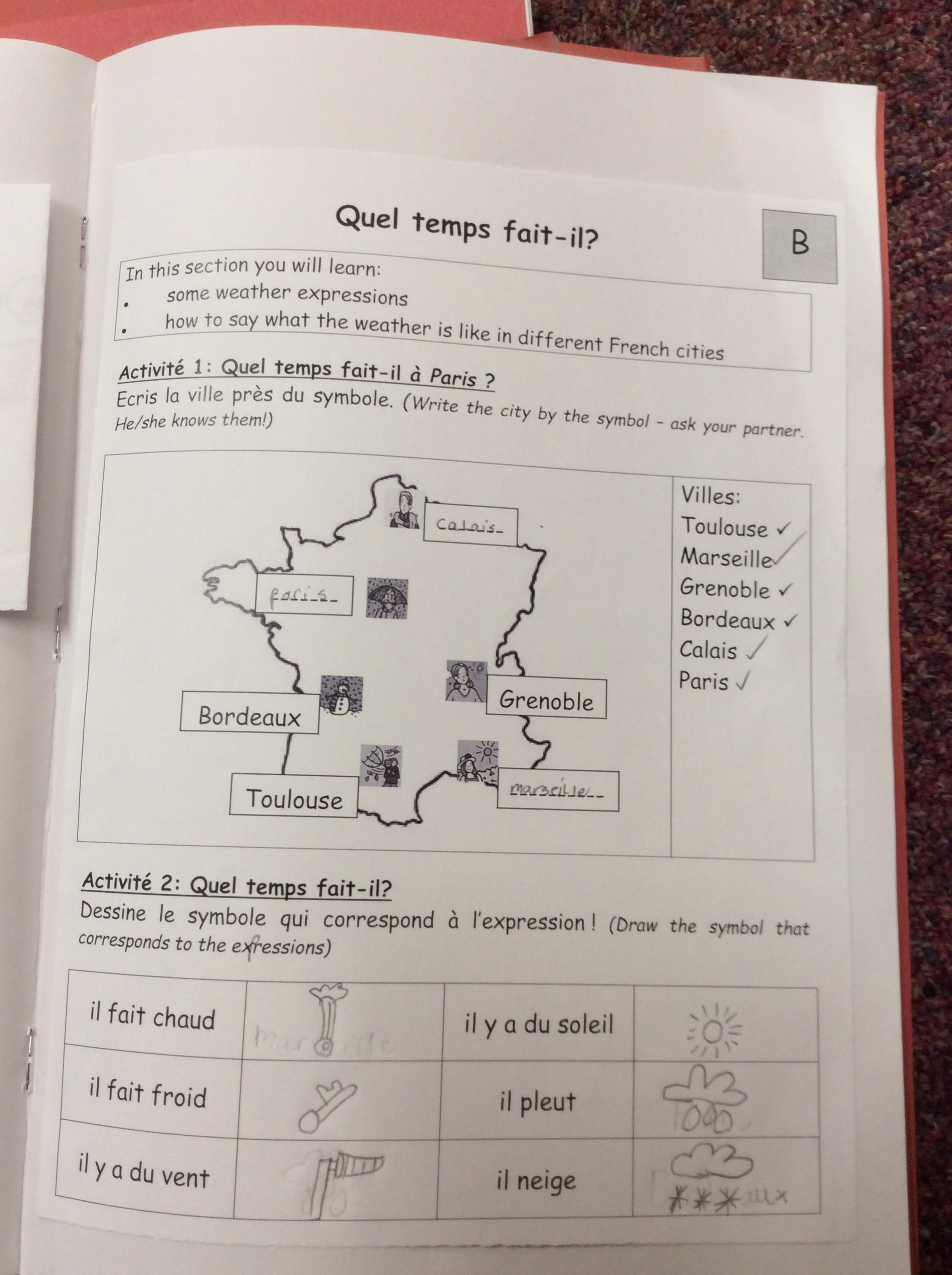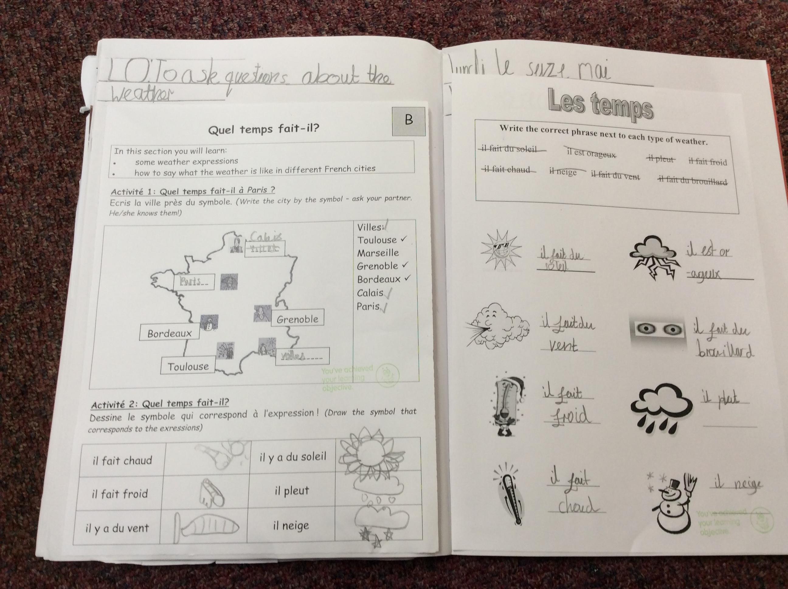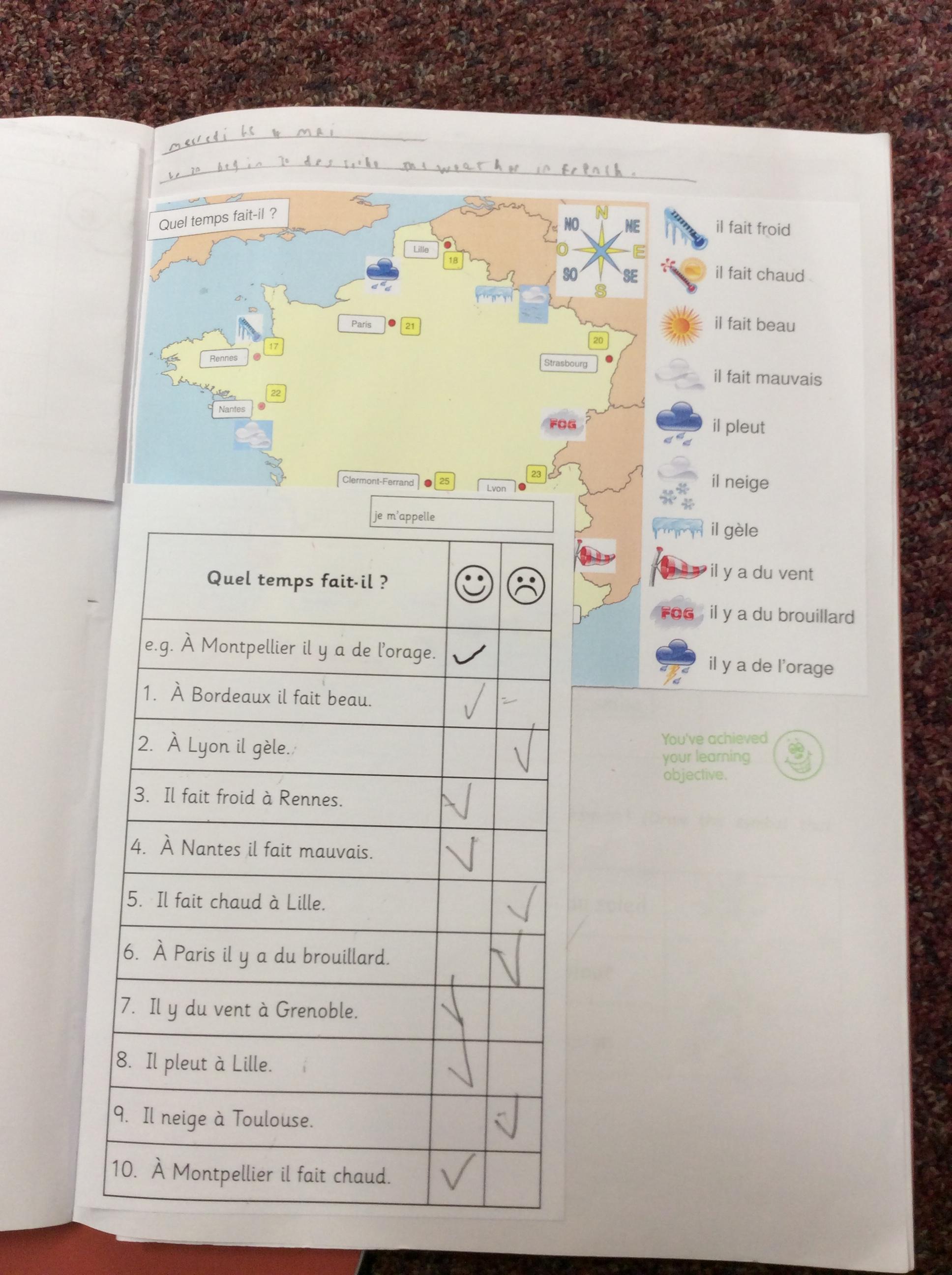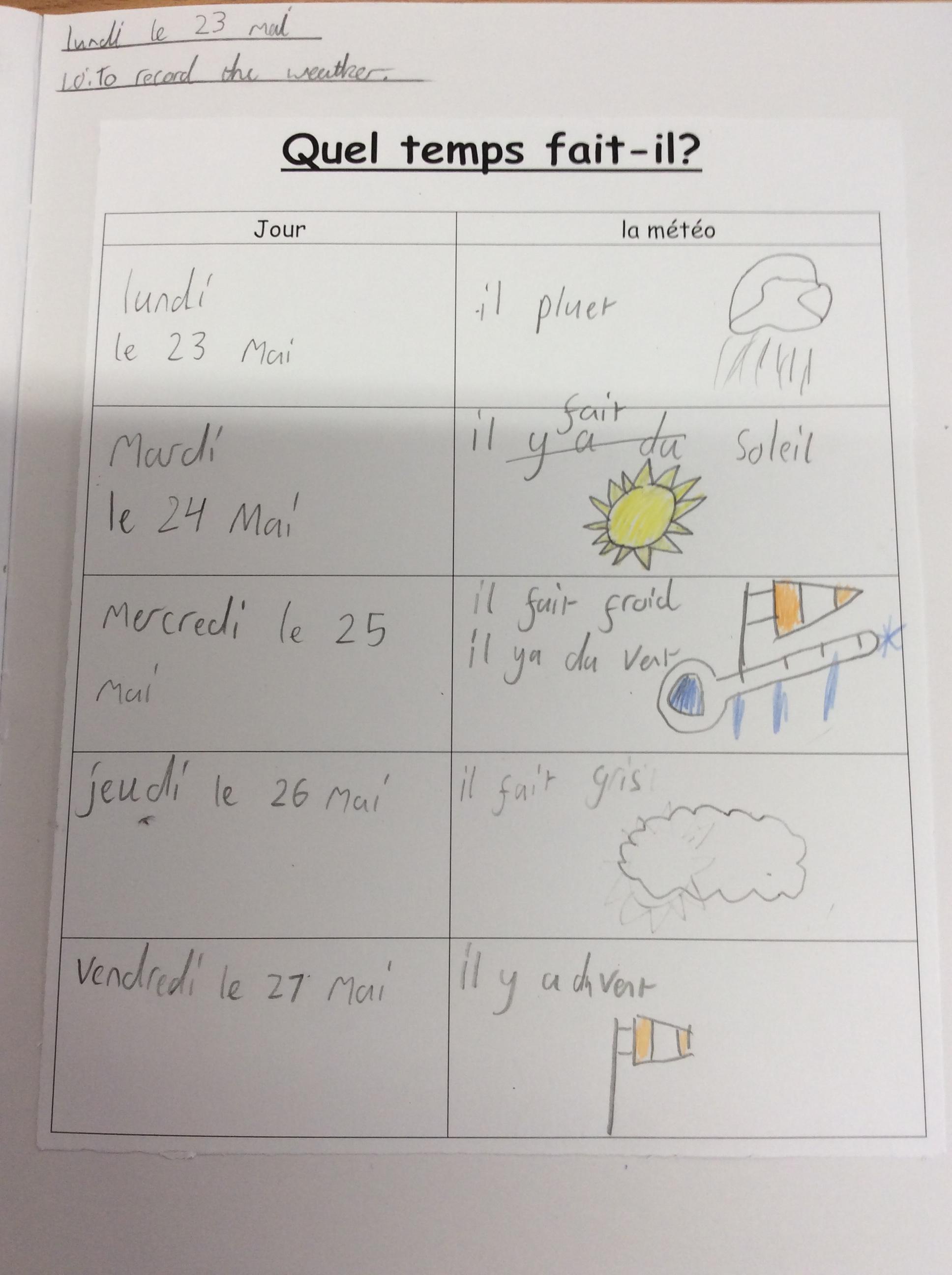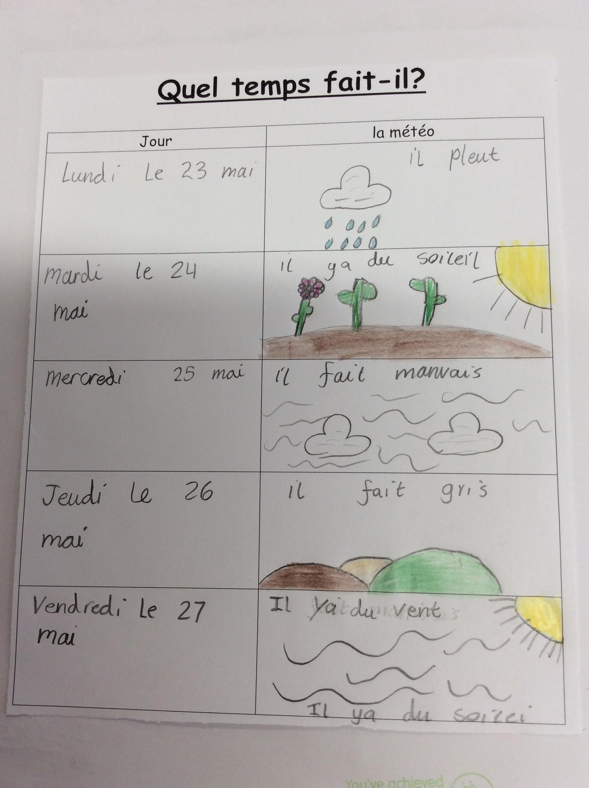 This term in French we have been asking and answering questions about the weather. We named the different types of weather in French, spoke about the weather we like and dislike, answered true and false questions and located cities and their weather on maps. For our final week of term we are keeping a weather diary, asking ourselves the question each day, 'Quel temps fait-il?' and recording the results.