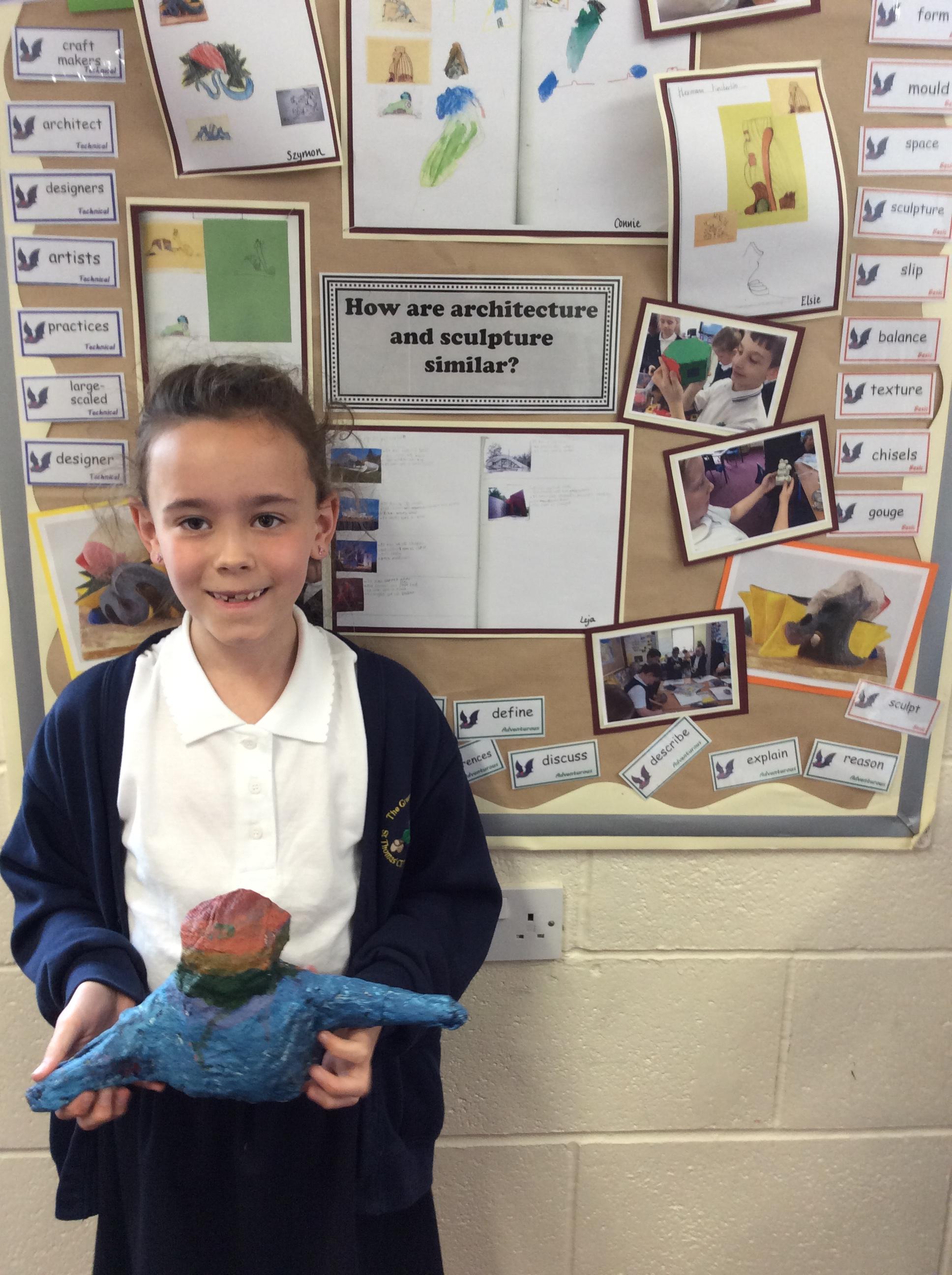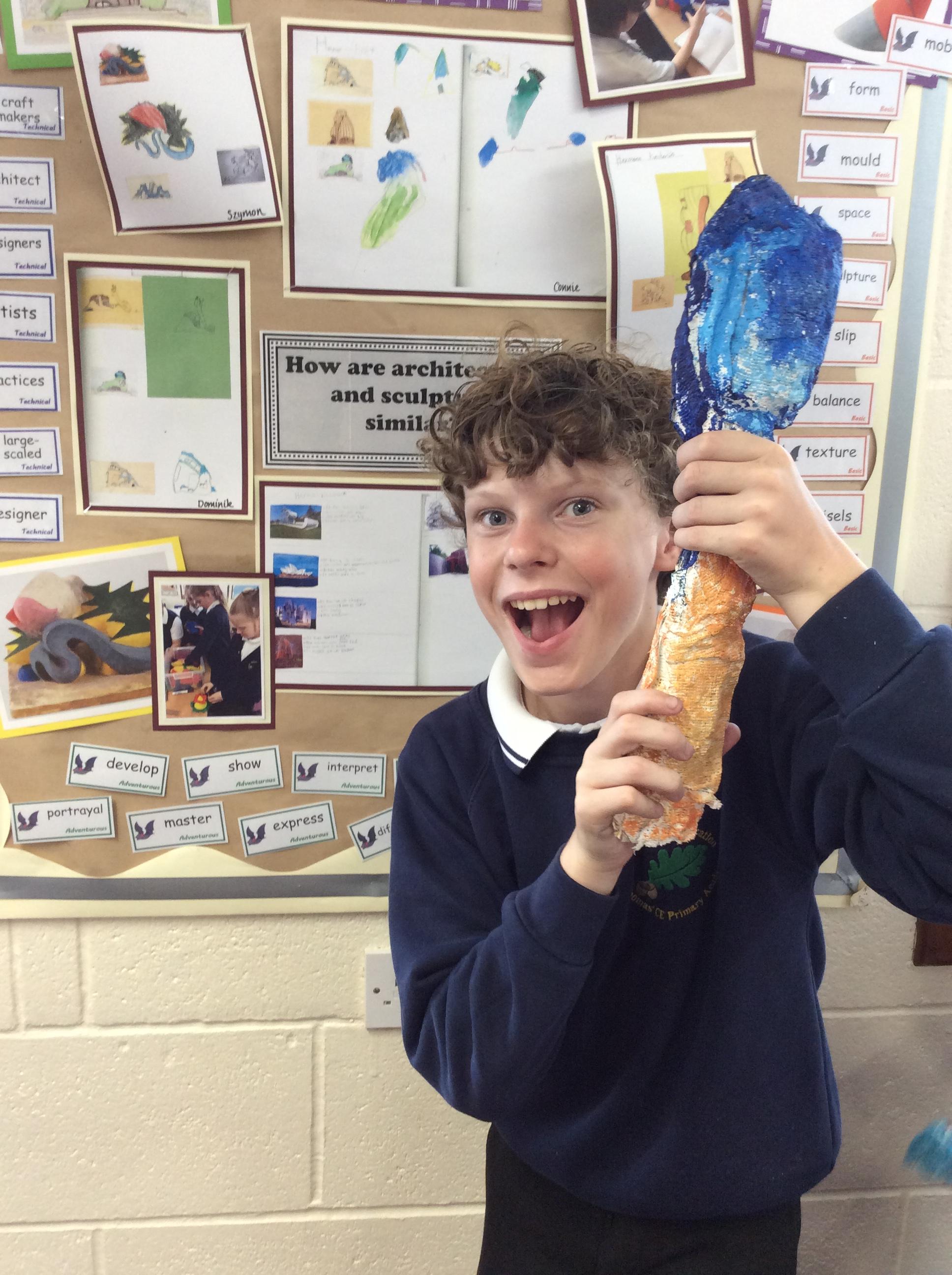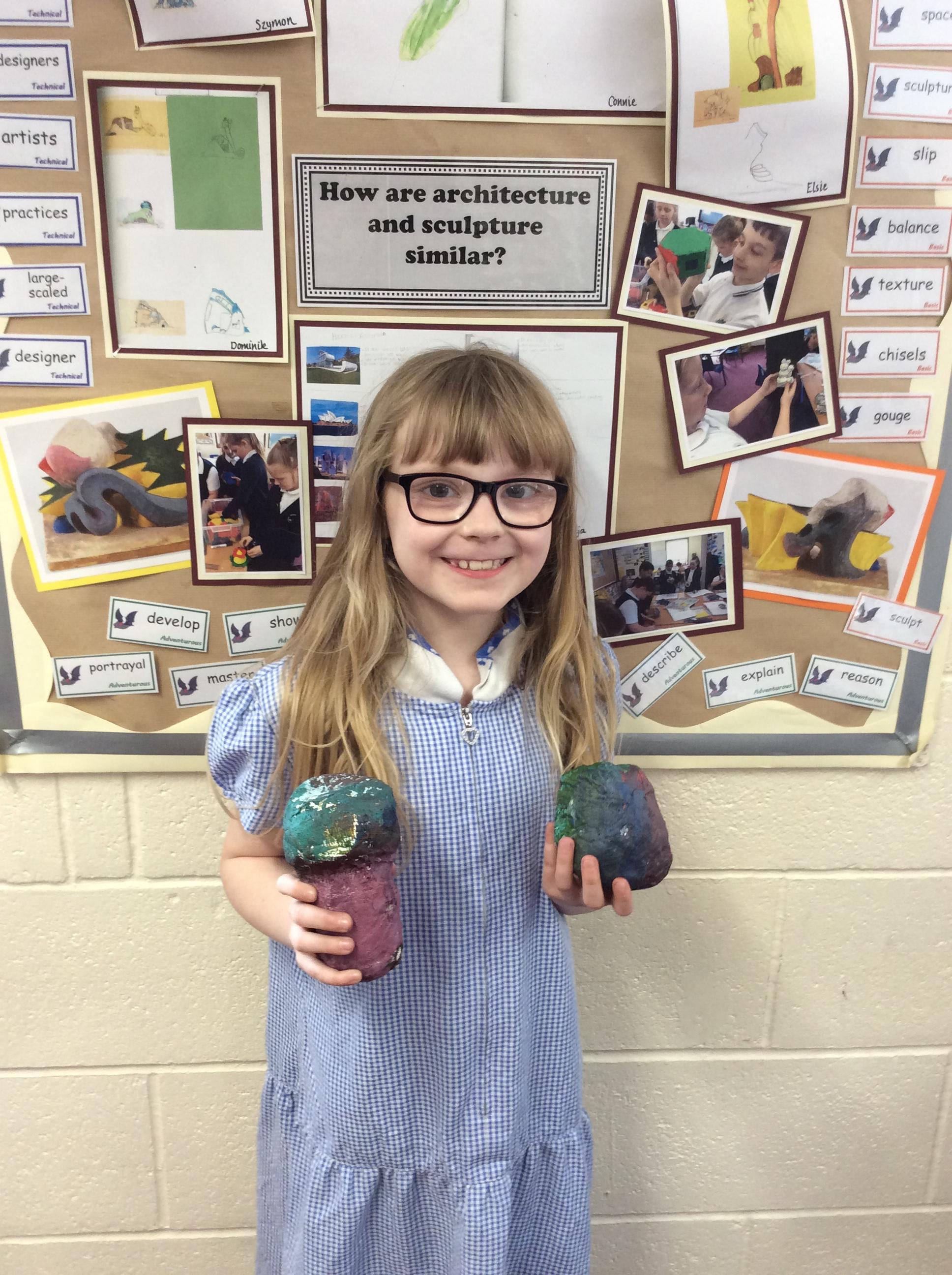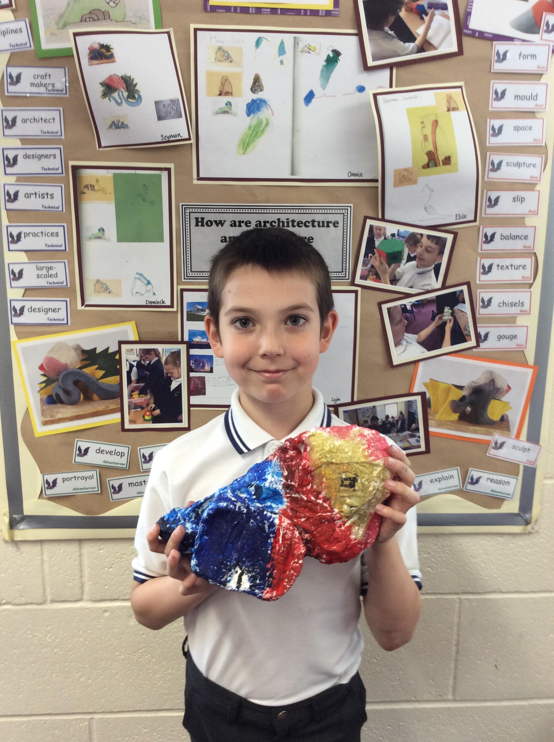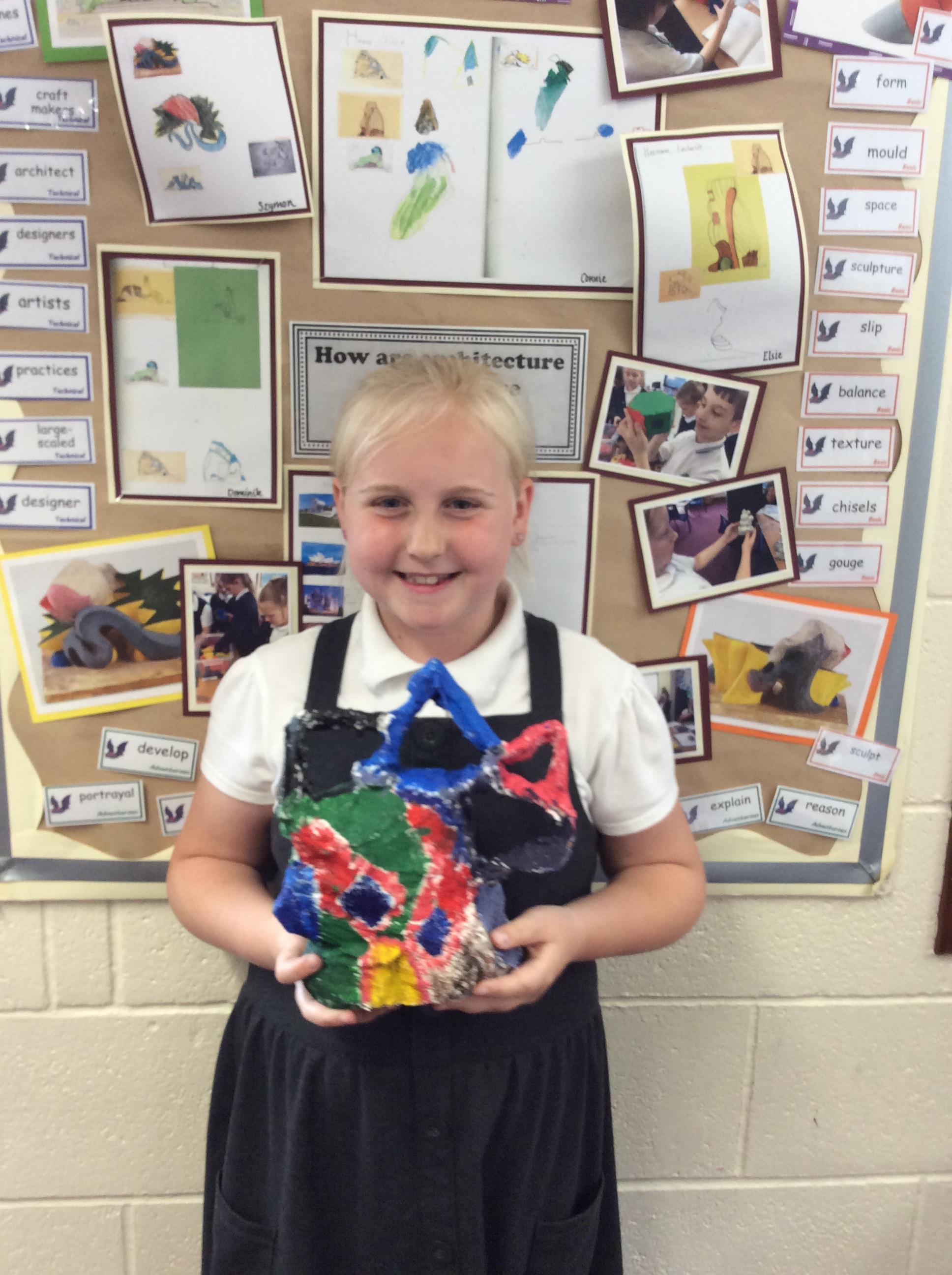 As we end of unit of work on sculpture and architecture, we were proud to share our finished sculptures with one another. After exploring the work of Hermann Finsterlin, sketching our own ideas, creating models using newspaper, adding Modroc to create our sculpture and painting them- we are finally finished! We discussed with our peers the type of place our sculptures would be placed in the world. For some, they would camouflage and blend into their surroundings and others would be bright buildings on the landscape to create conversation and intrigue. Can you identify which are which from our photos?