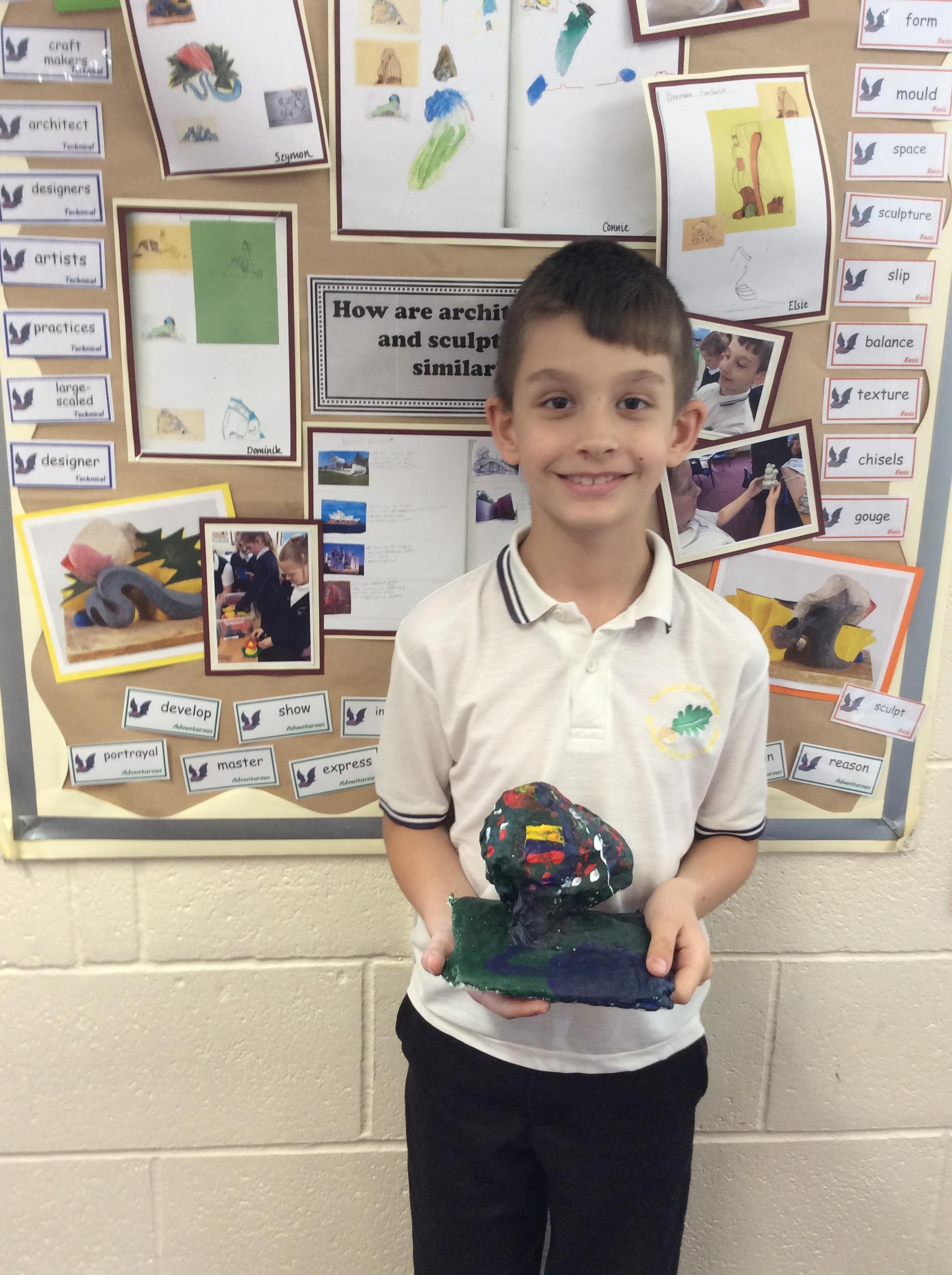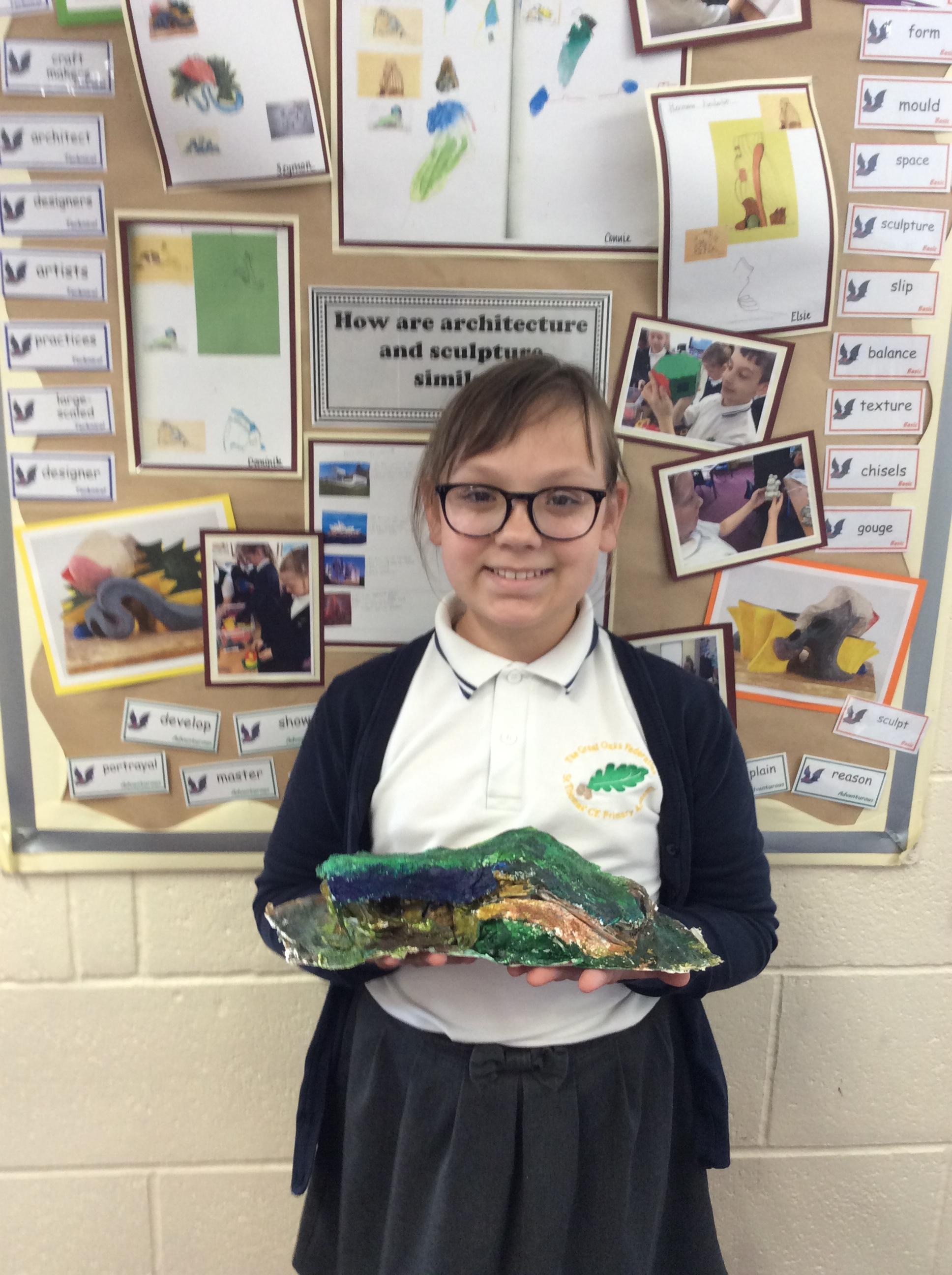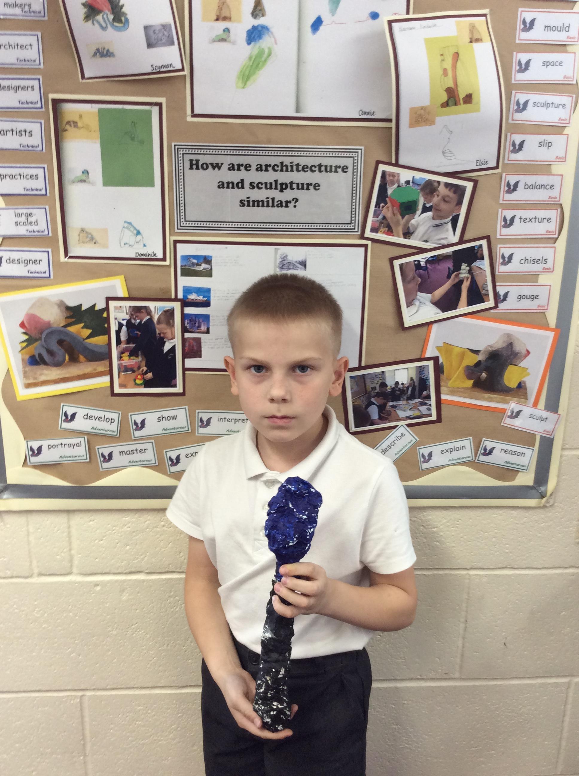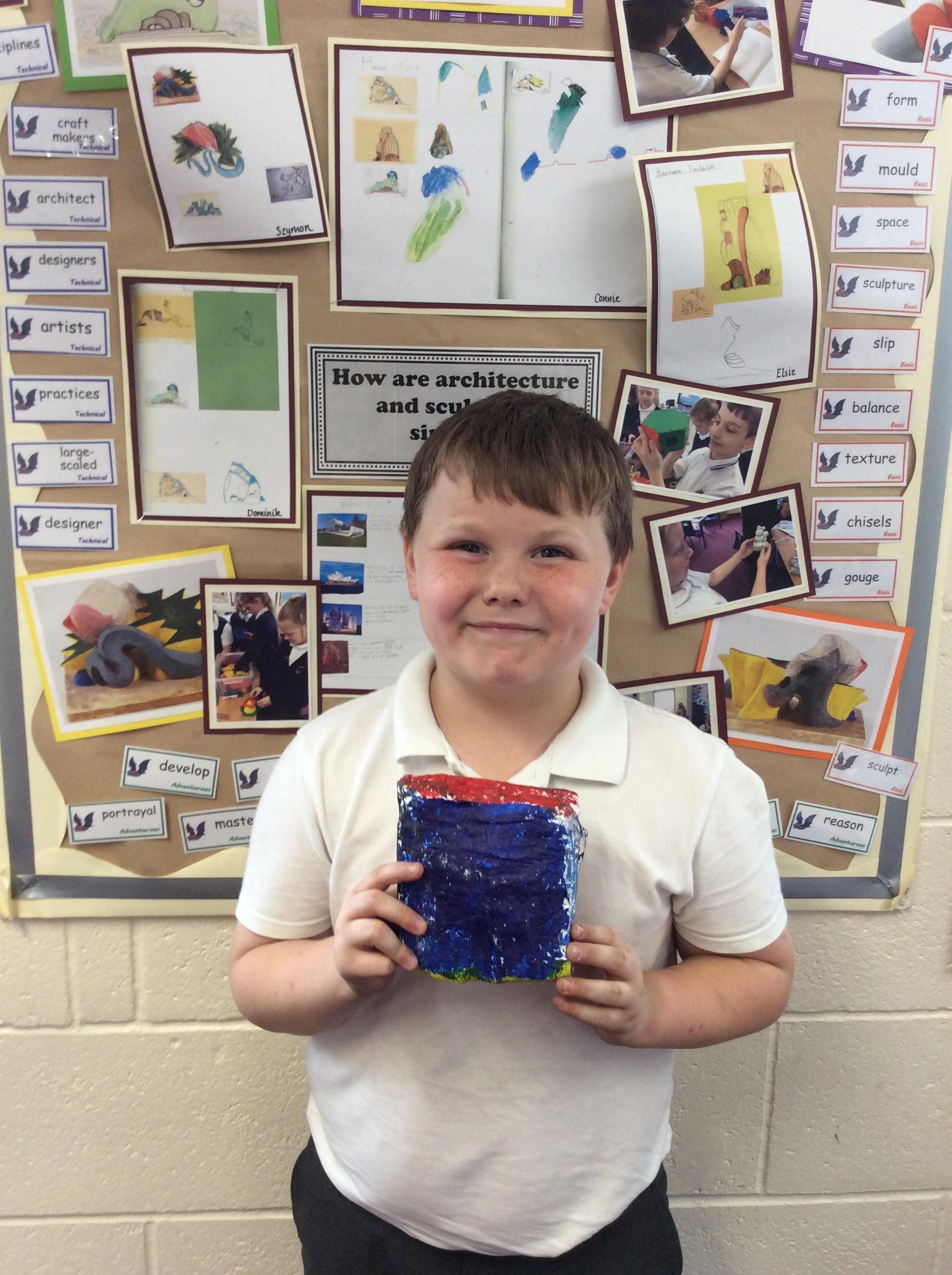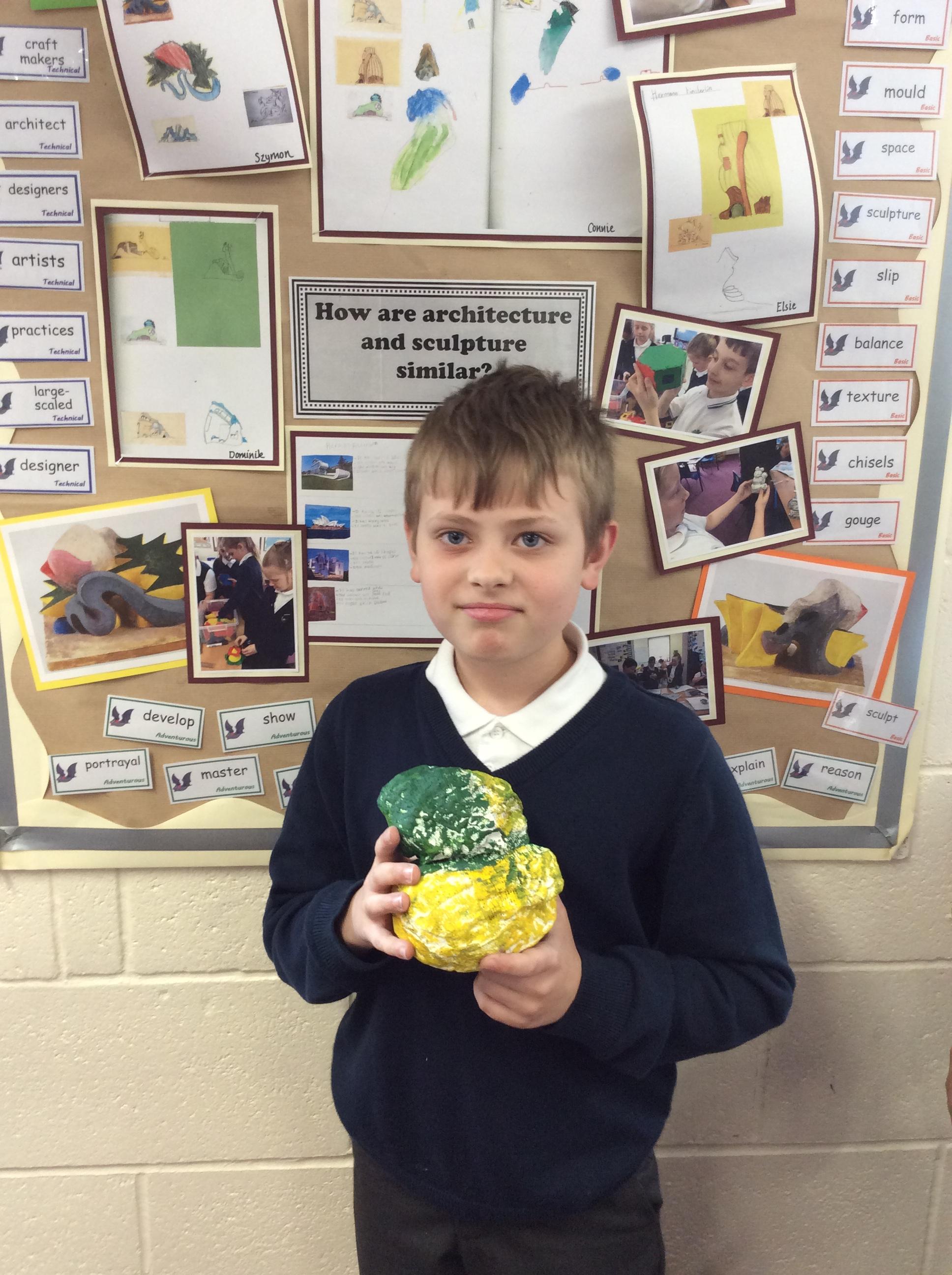 As we end of unit of work on sculpture and architecture, we were proud to share our finished sculptures with one another. After exploring the work of Hermann Finsterlin, sketching our own ideas, creating models using newspaper, adding Modroc to create our sculpture and painting them- we are finally finished! We discussed with our peers the type of place our sculptures would be placed in the world. For some, they would camouflage and blend into their surroundings and others would be bright buildings on the landscape to create conversation and intrigue. Can you identify which are which from our photos?