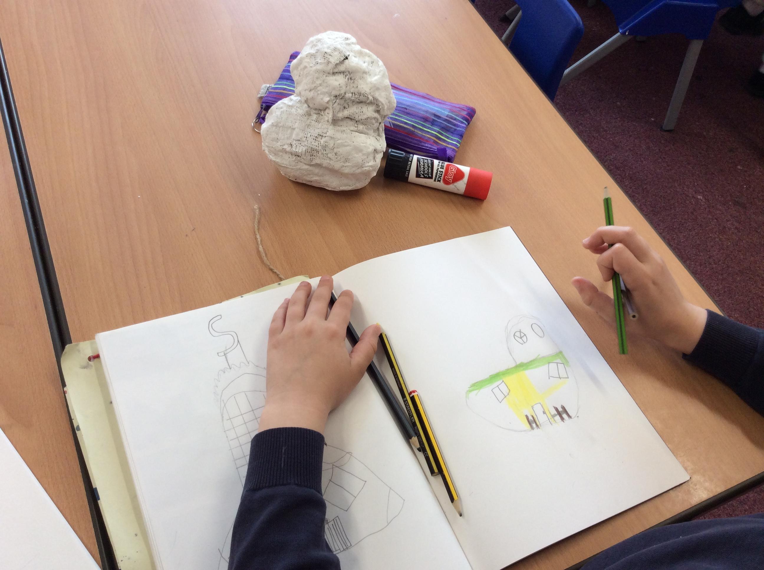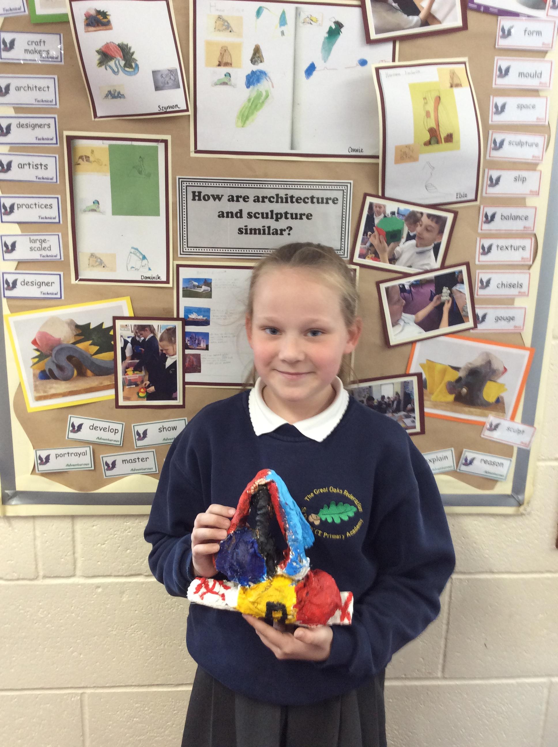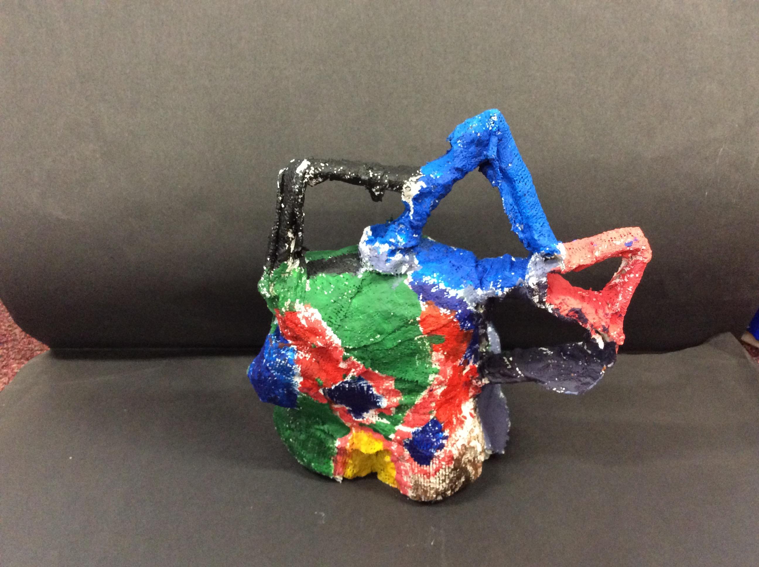 Recalling the work of Hermann Finsterlin, we worked as architects to design buildings in his style using curved lines and 3D shapes. We used 3D shape kits to help us explore structures and how they can be balanced to create work in his style. After deciding on a shape for our work, we made it out of newspaper, before adding modroc strips to create a solid structure. Once it had dried, we then added paint, thinking carefully about the colour palette that we wanted to use. We also thought about where our structure would be built and if we wanted it to camouflage into its surroundings or stand out and be iconic with its style and colour.