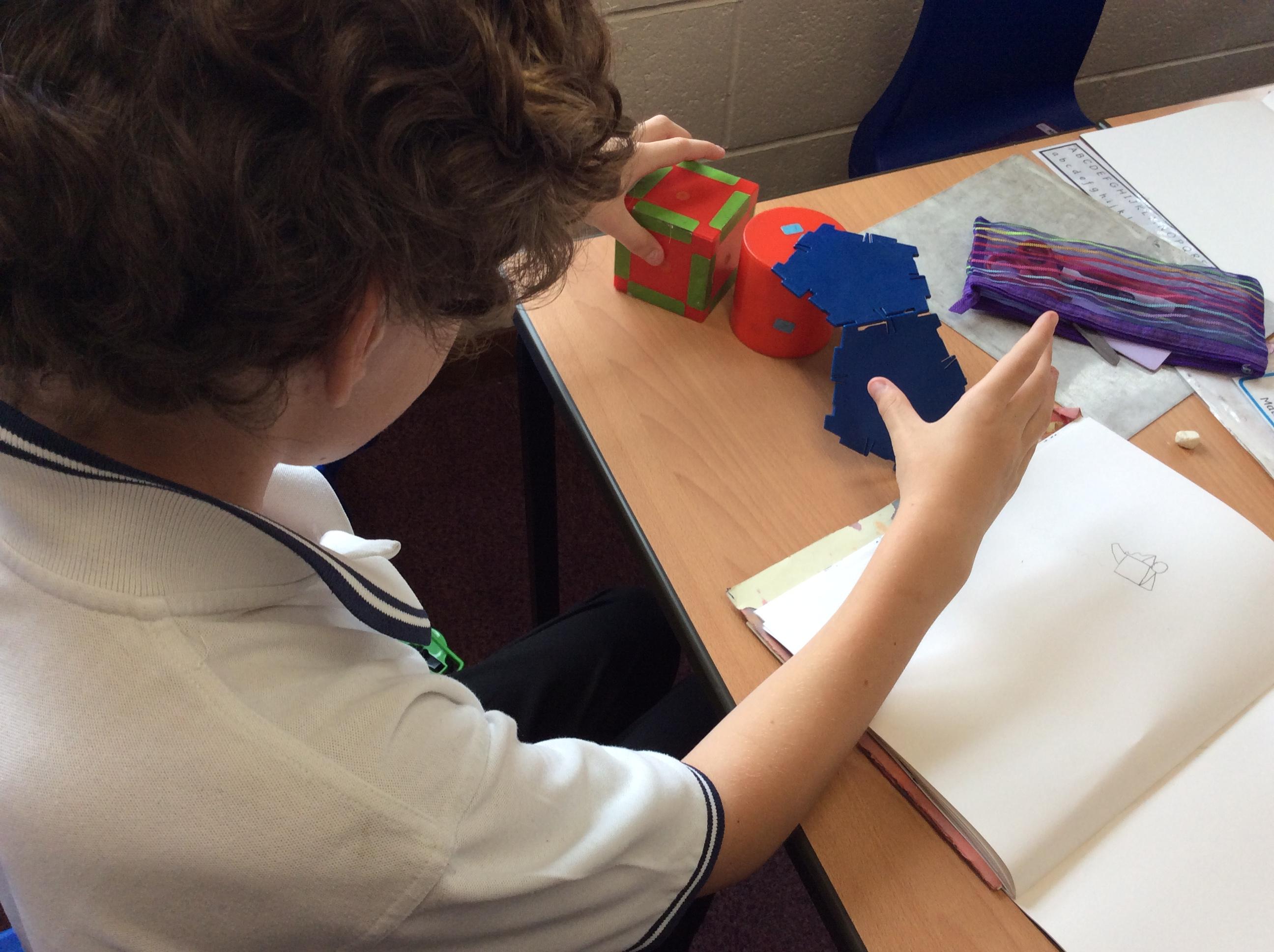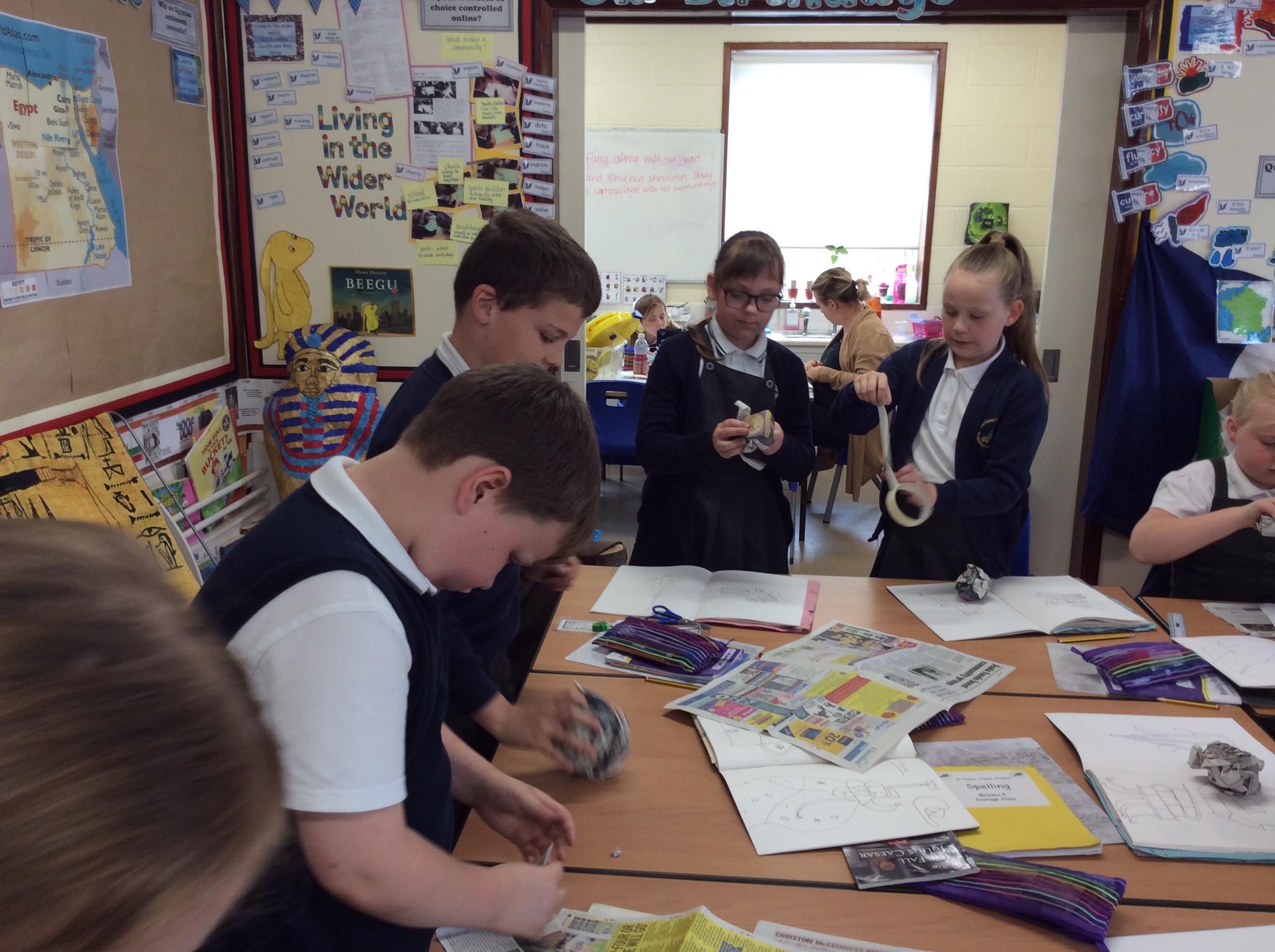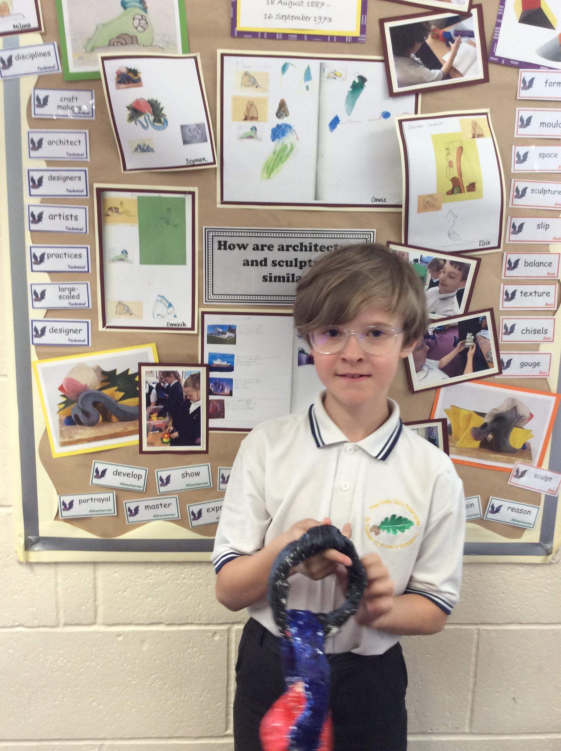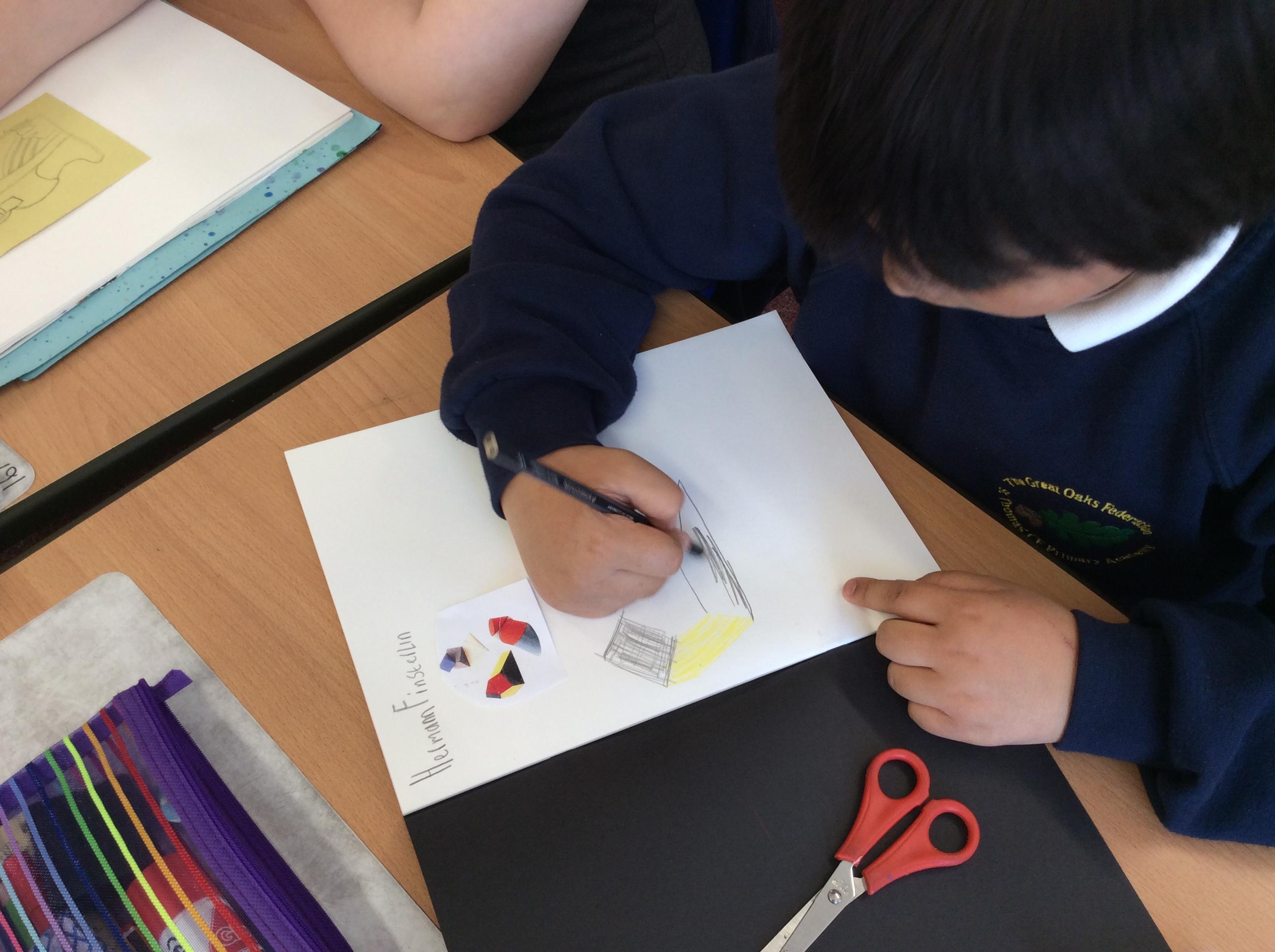 Recalling the work of Hermann Finsterlin, we worked as architects to design buildings in his style using curved lines and 3D shapes. We used 3D shape kits to help us explore structures and how they can be balanced to create work in his style. After deciding on a shape for our work, we made it out of newspaper, before adding modroc strips to create a solid structure. Once it had dried, we then added paint, thinking carefully about the colour palette that we wanted to use. We also thought about where our structure would be built and if we wanted it to camouflage into its surroundings or stand out and be iconic with its style and colour.