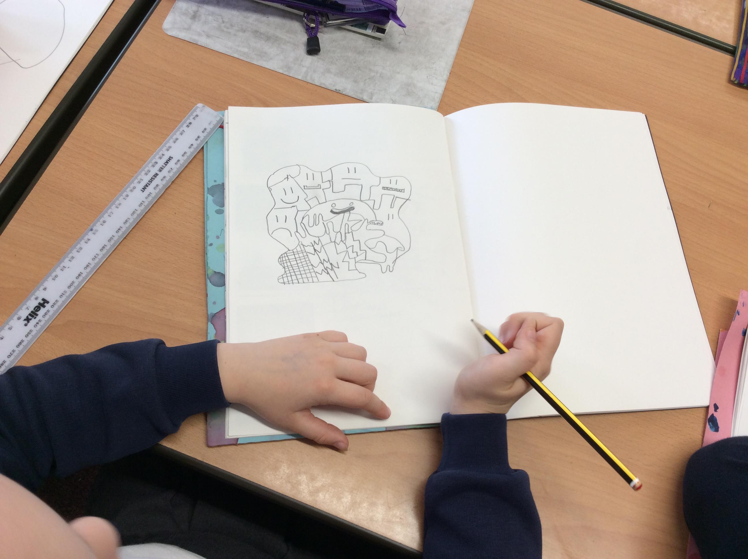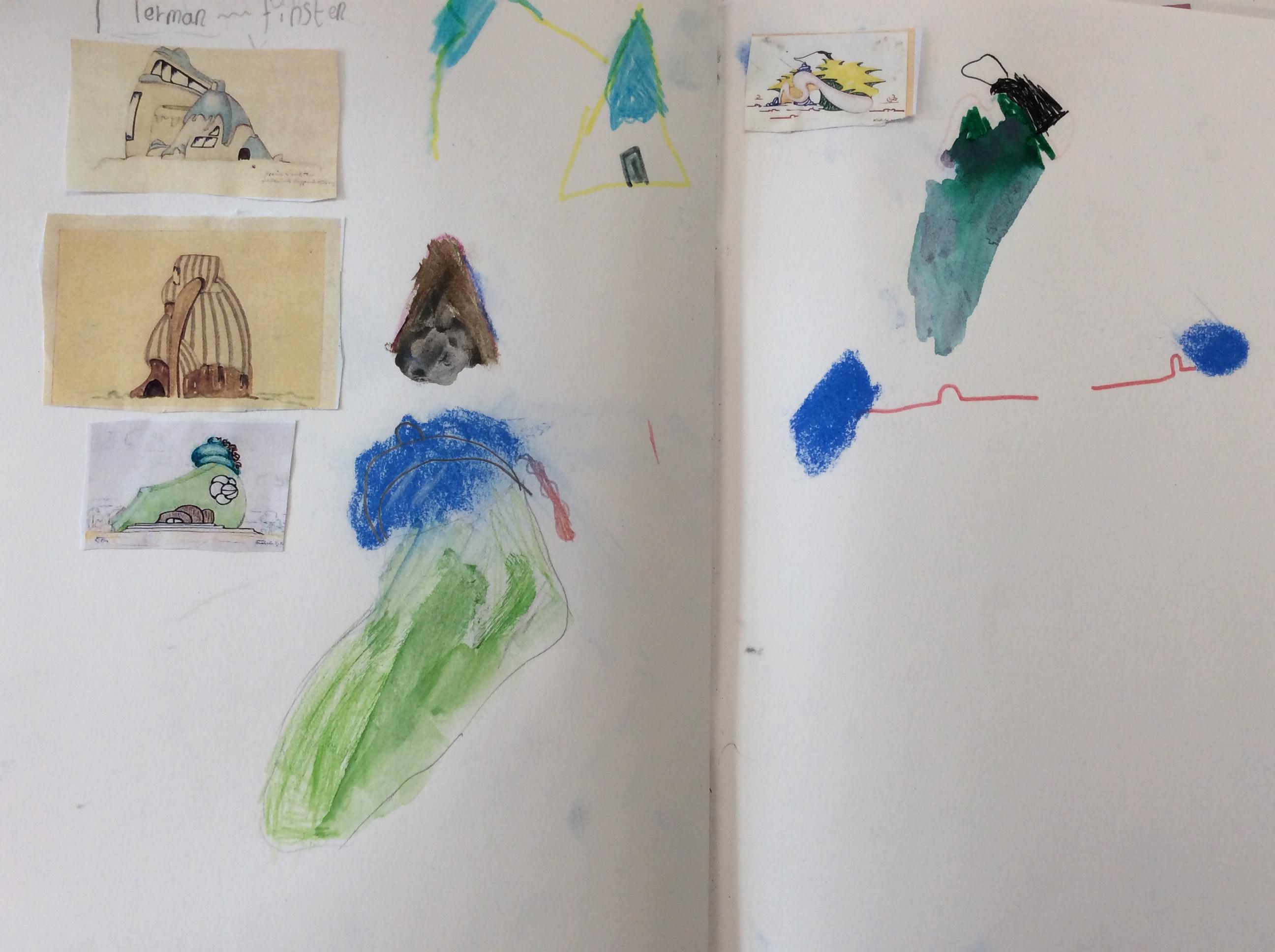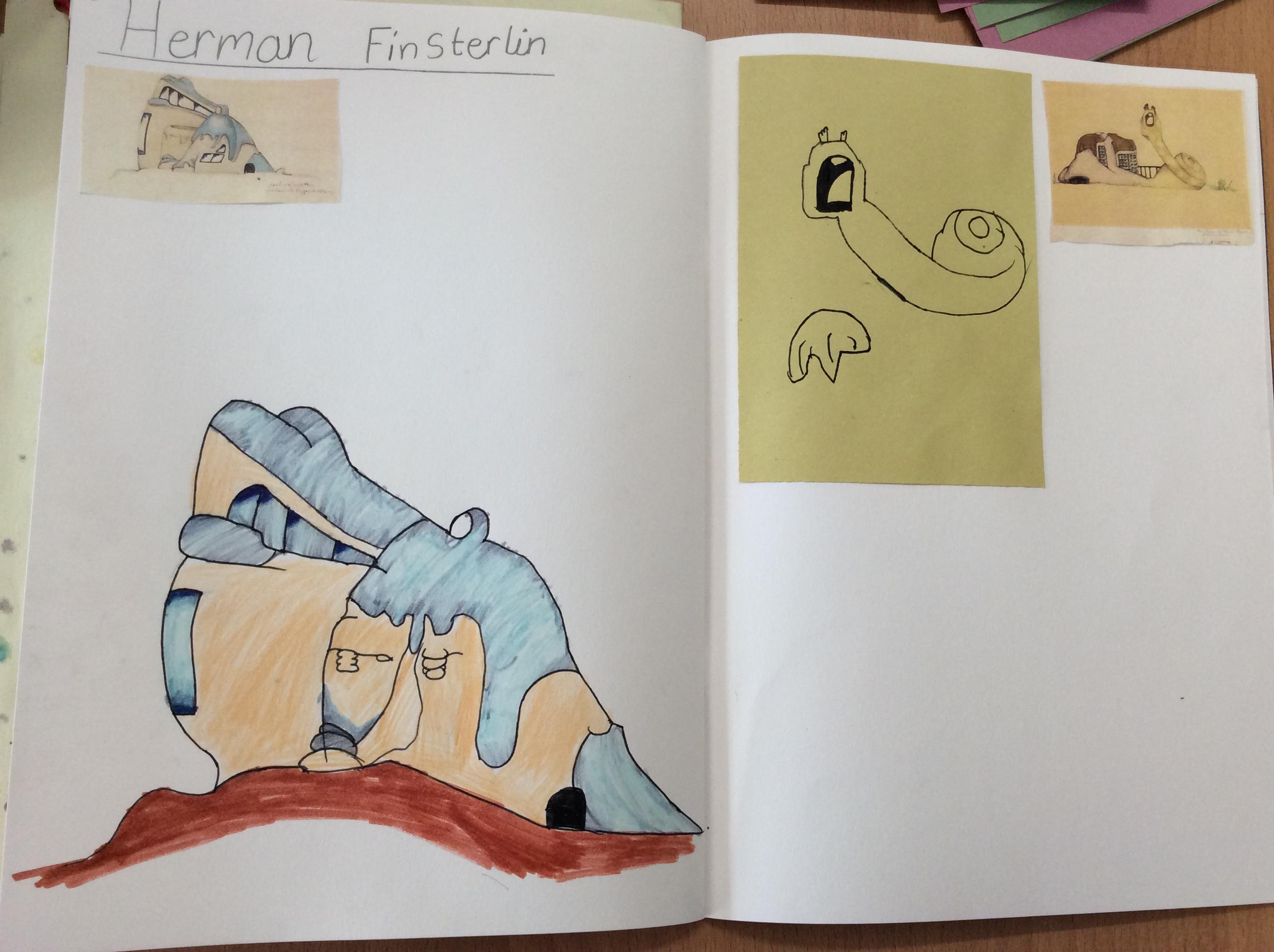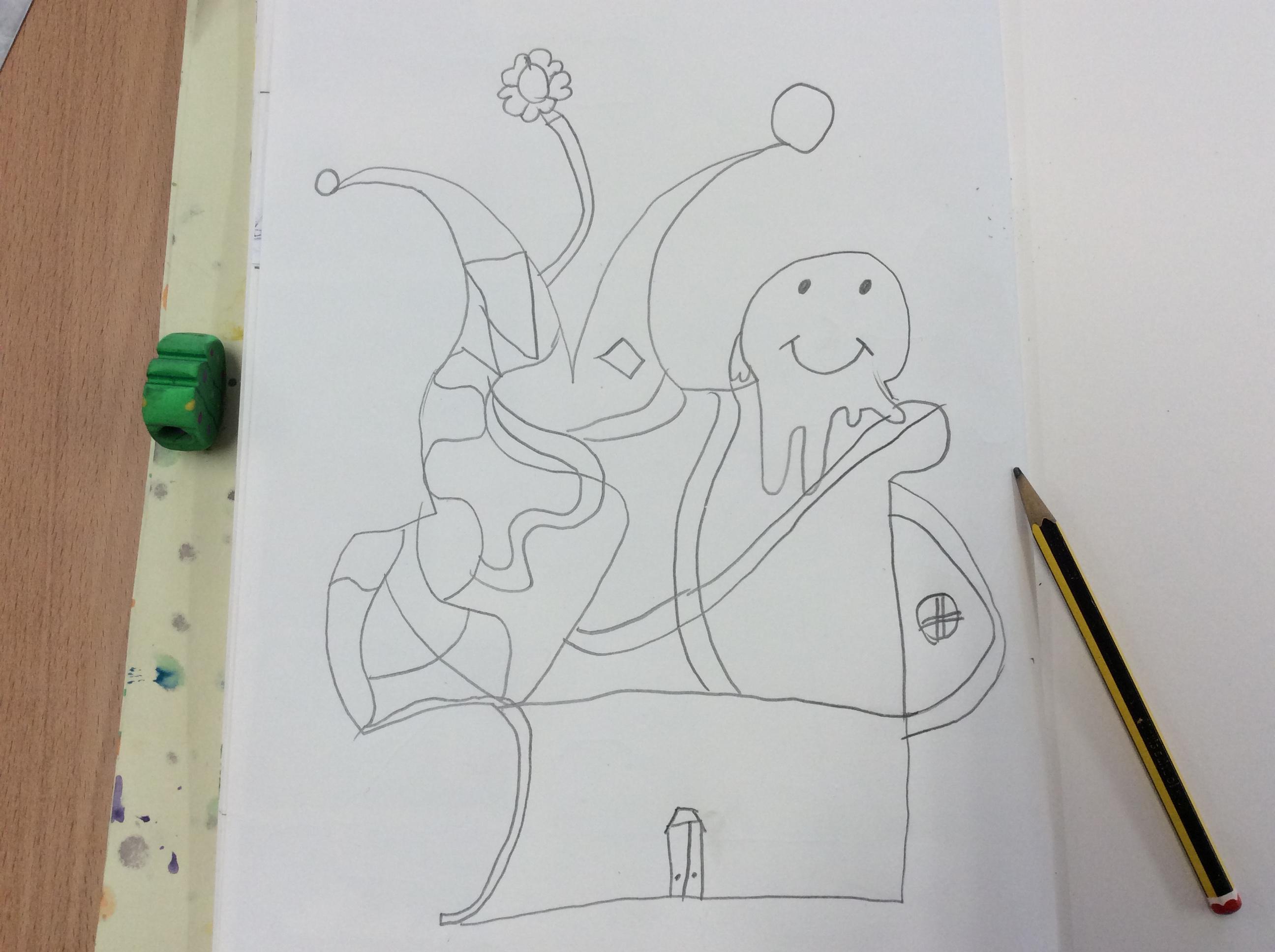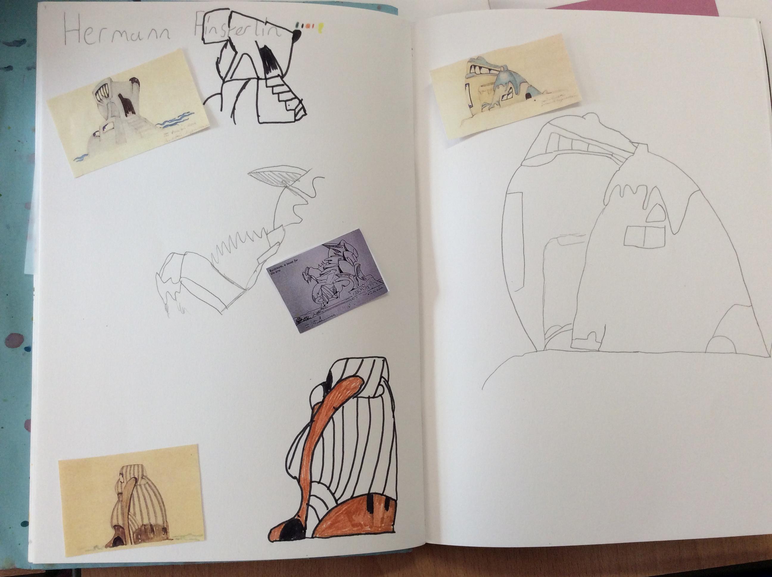 This term we are exploring the work of German architect Hermann Finsterlin. Looking at his sketches we noted his use of curved lines, 3D shapes and colour. Commenting on his somewhat crazy designs, we explored how he had created the sketches by creating the lines for ourselves using different media, similar to Finsterlin.