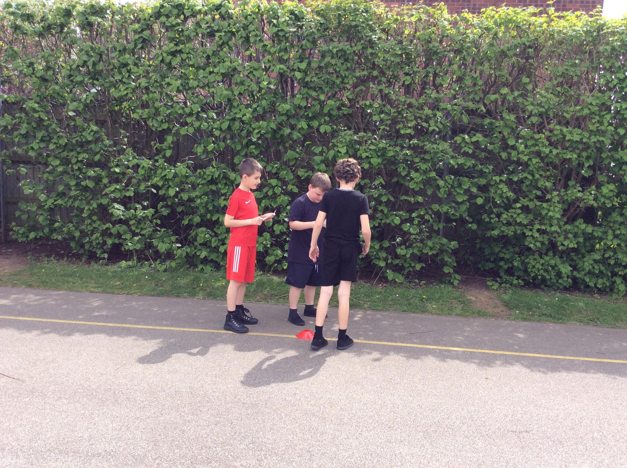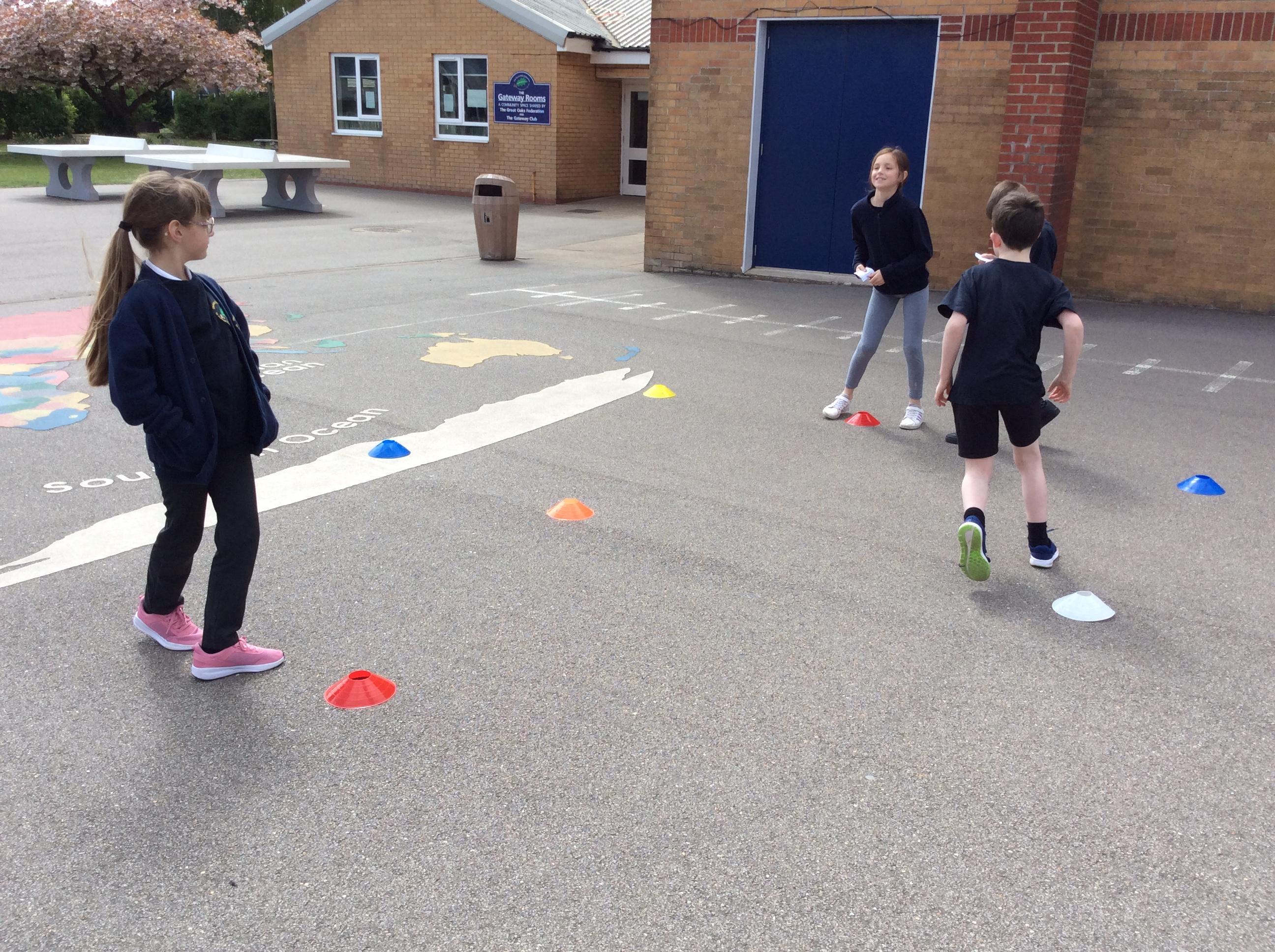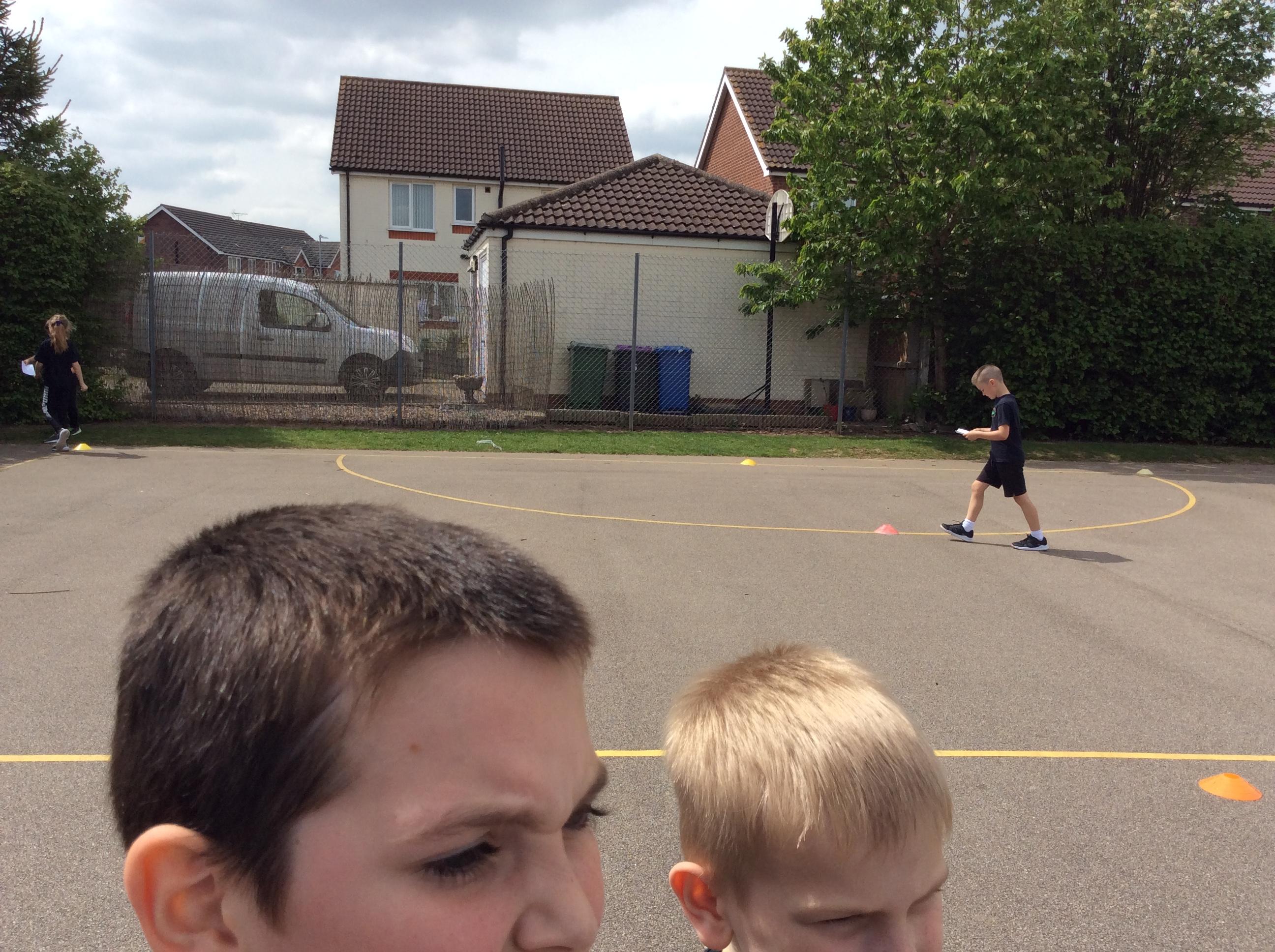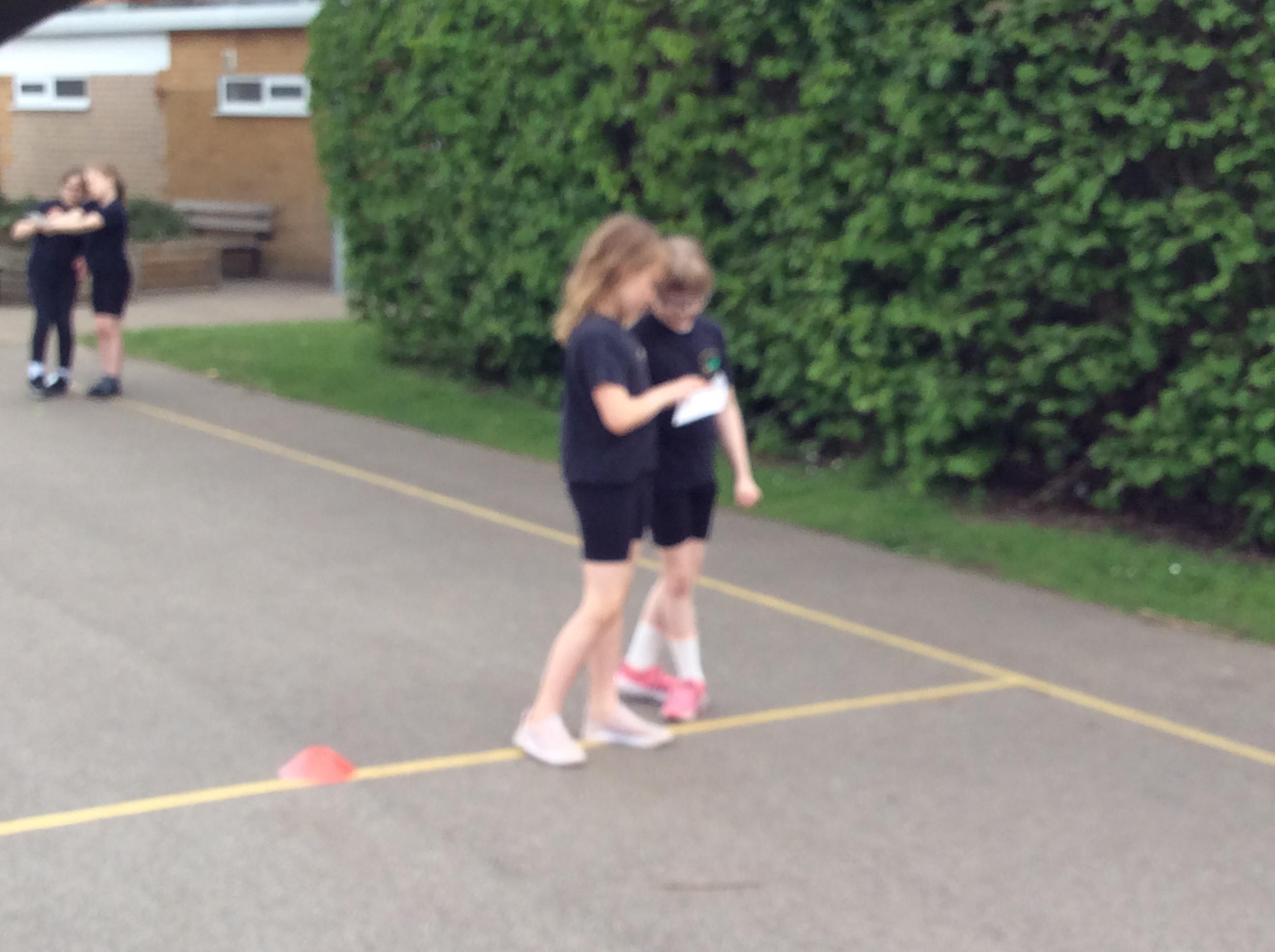 In orienteering, we used a map to navigate around a netball court. Using the markings on the playground, cones were set into position and maps given out to show each cone. After navigating to the correct cone, we looked at the number on the bottom and reported the number back to check we had been to the correct cone.