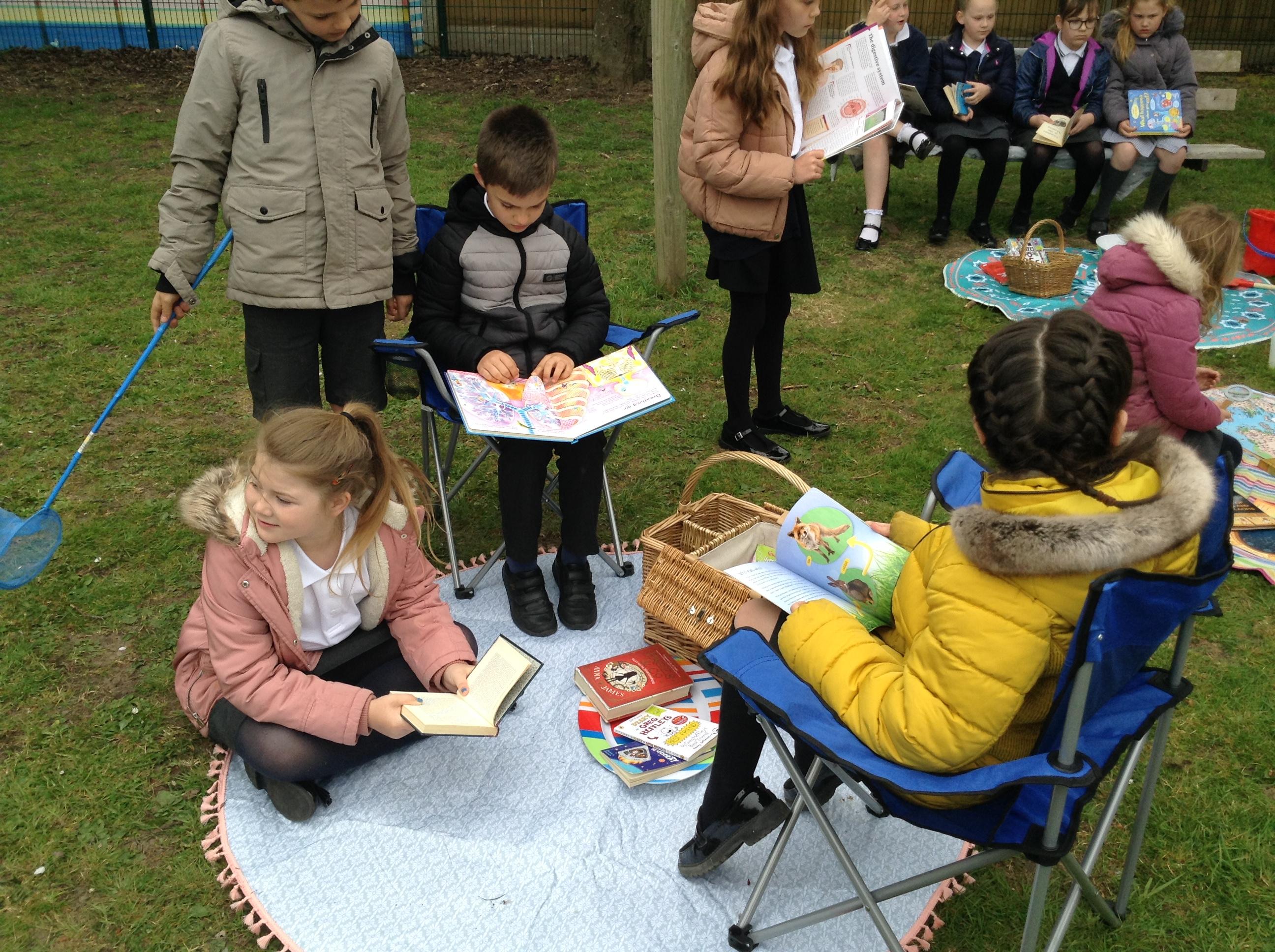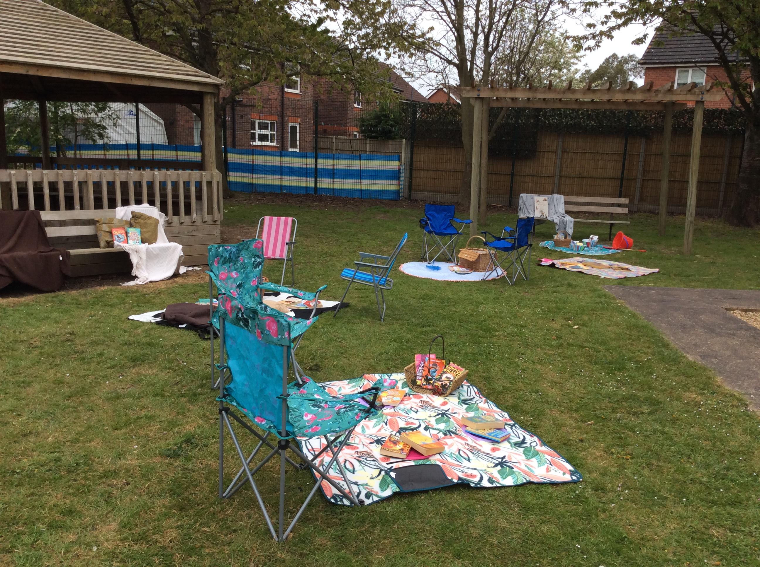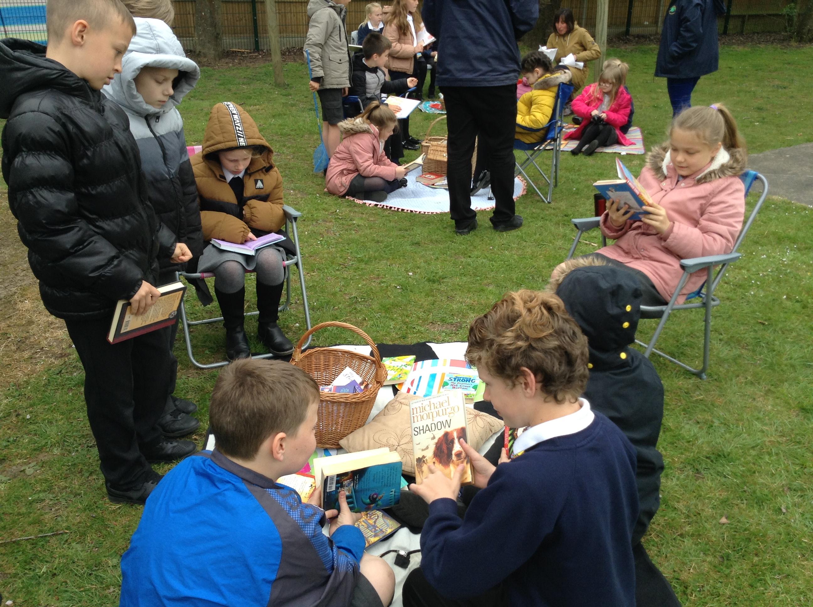 This week we had a lovely surprise as a reading picnic, or 'booknic' was set up for us on the field. We went outside and enjoyed sharing books together, reading and discussing books with friends or sitting quietly to get a few chapters ahead with the book we had already been enjoying at home!
