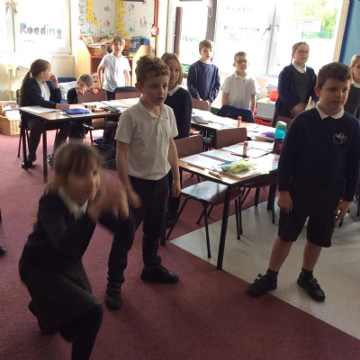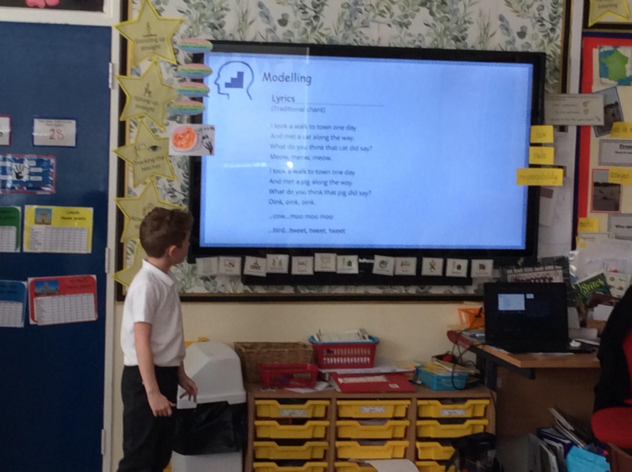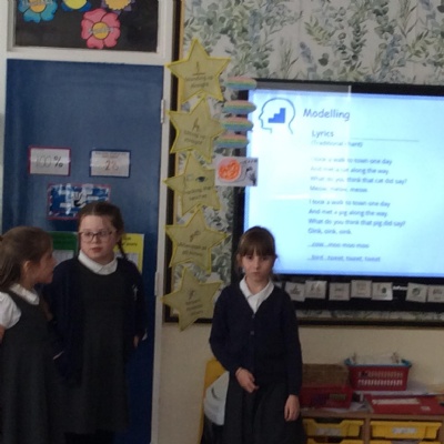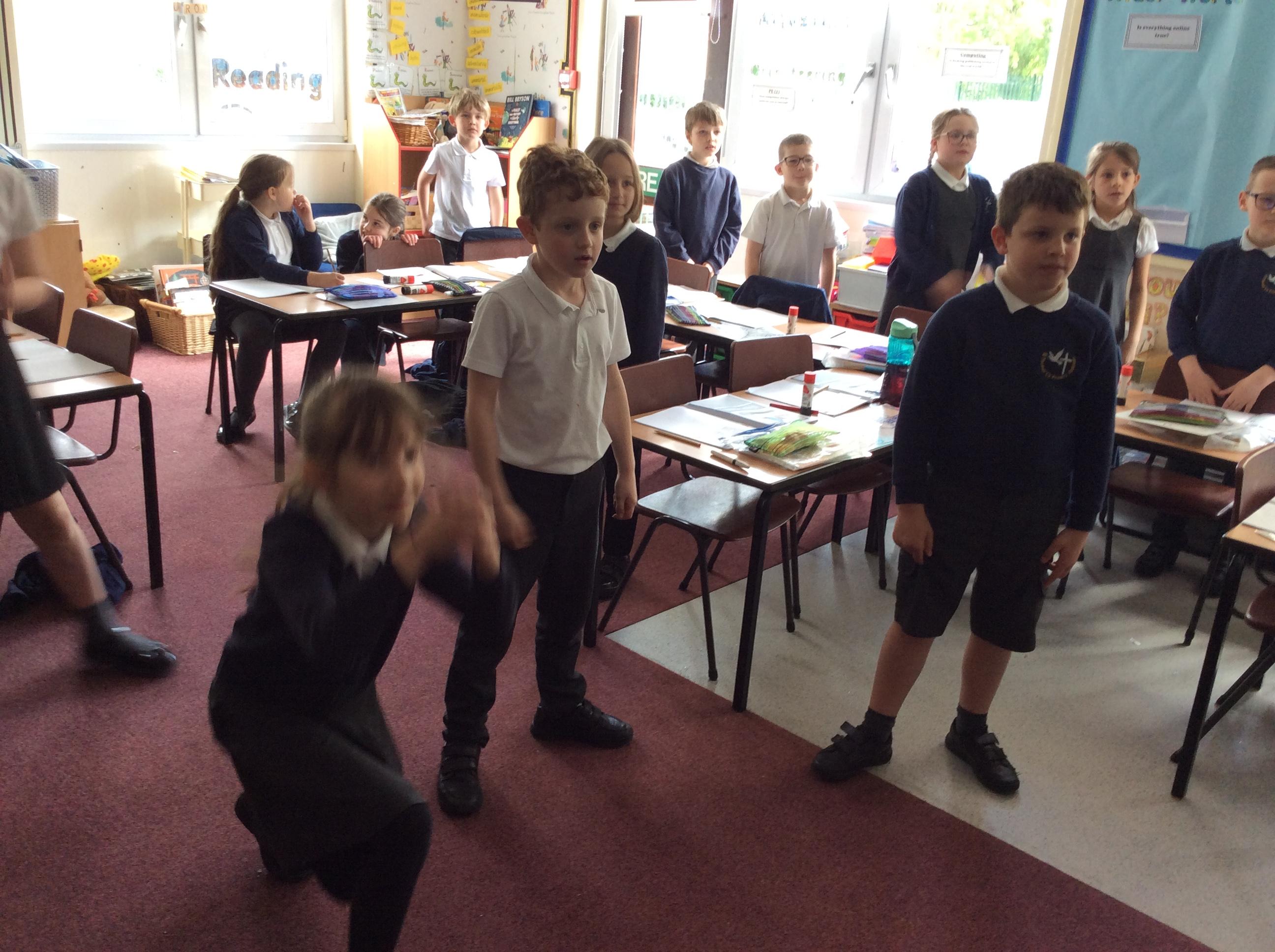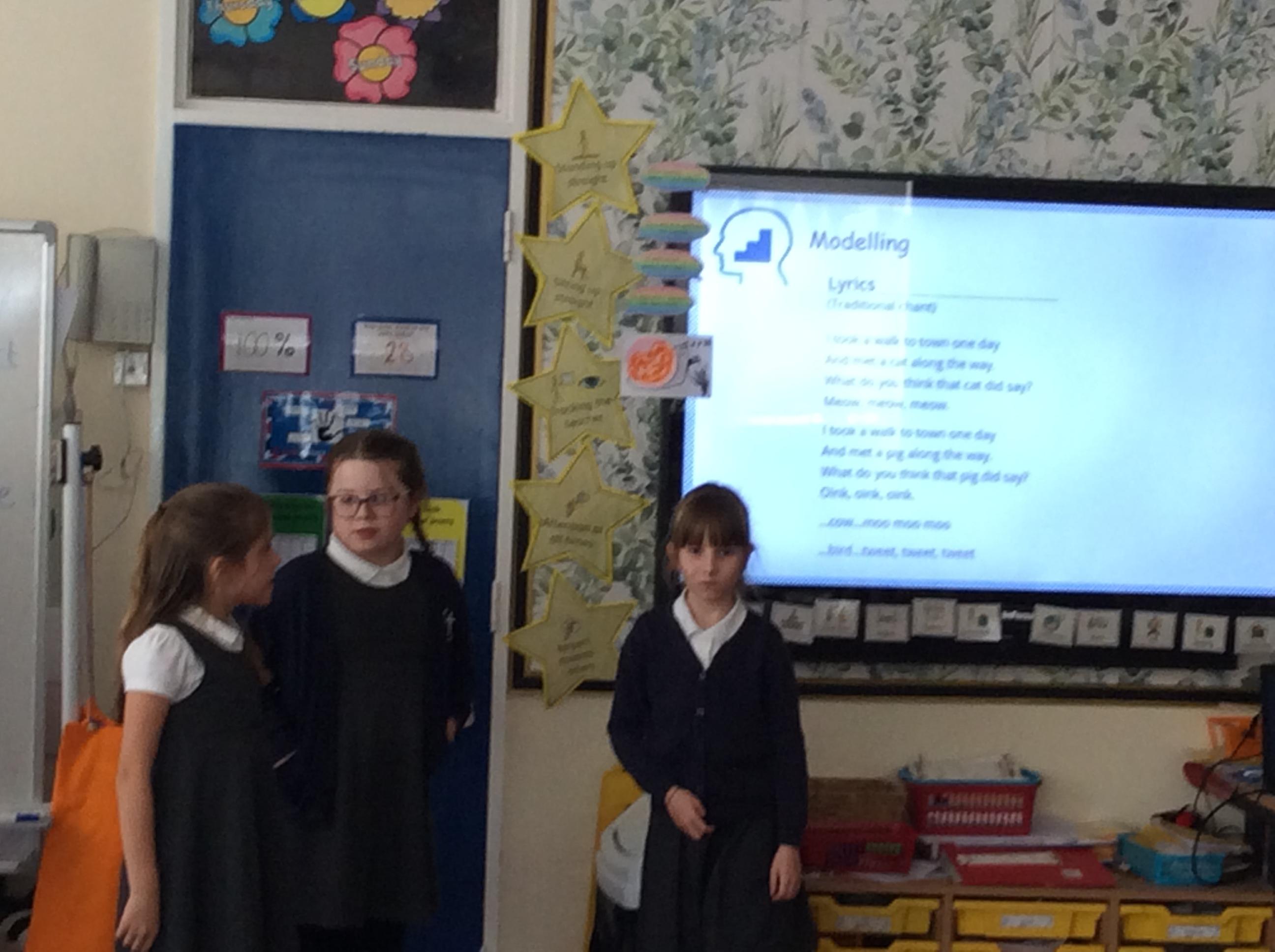 We sang in unison to perform some chants. Using call and response, we performed 'Boom Chicka Boom' before learning a new chant. When getting to ‘What do you think that ______ did say?’, we took it in turns to respond with the noise the animal makes. The rest of the class then respond with that sound. We then began to take the lead.