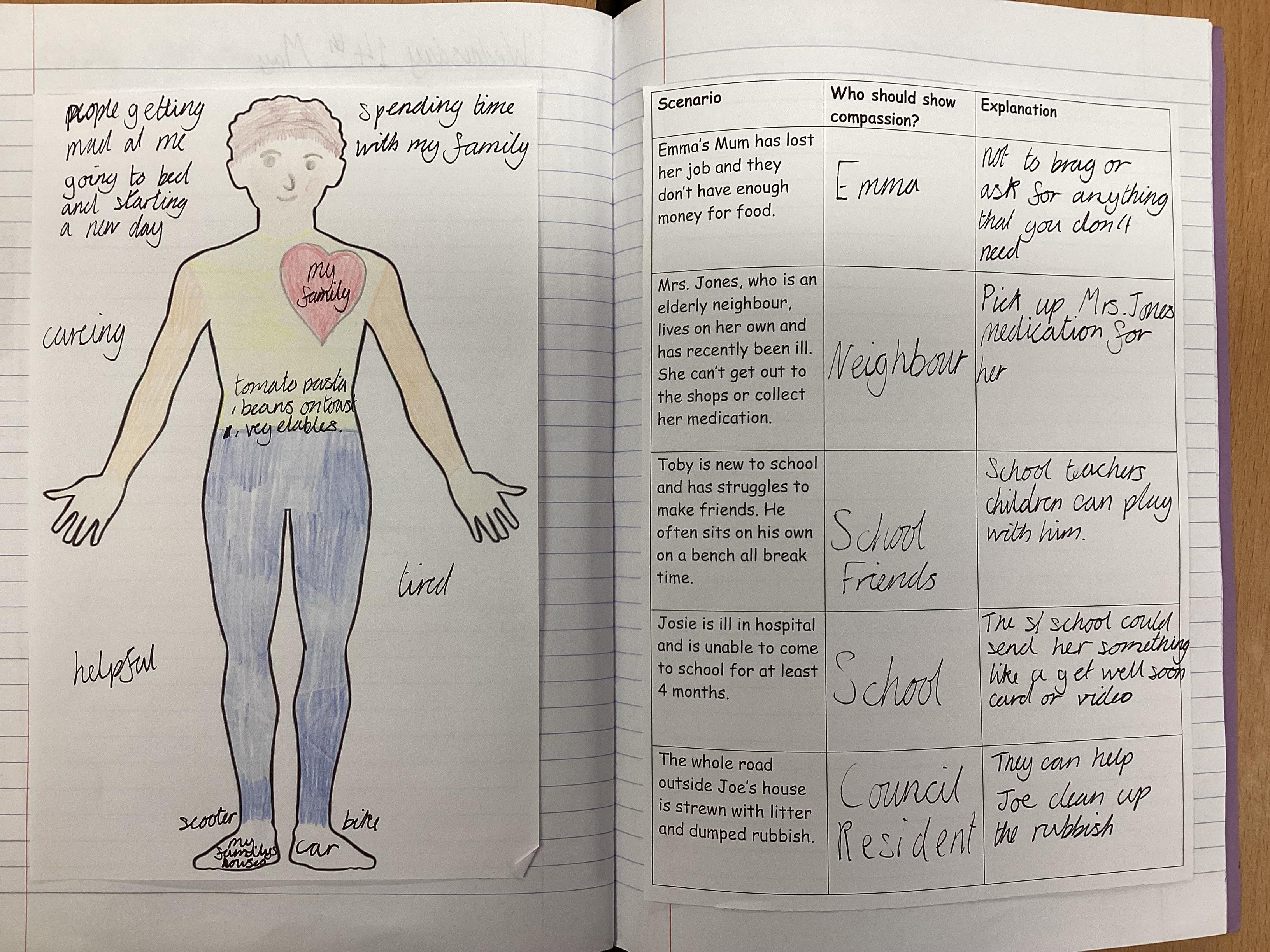 In this lesson, we spoke about how we feel and the experiences that we have had and how they made us feel. We discussed how some people may have had different experiences than others and that we never realise what people have been through. We filled a body outline on how our body feels when we are excited or sad. Then we looked at how we can show compassion through scenarios.
