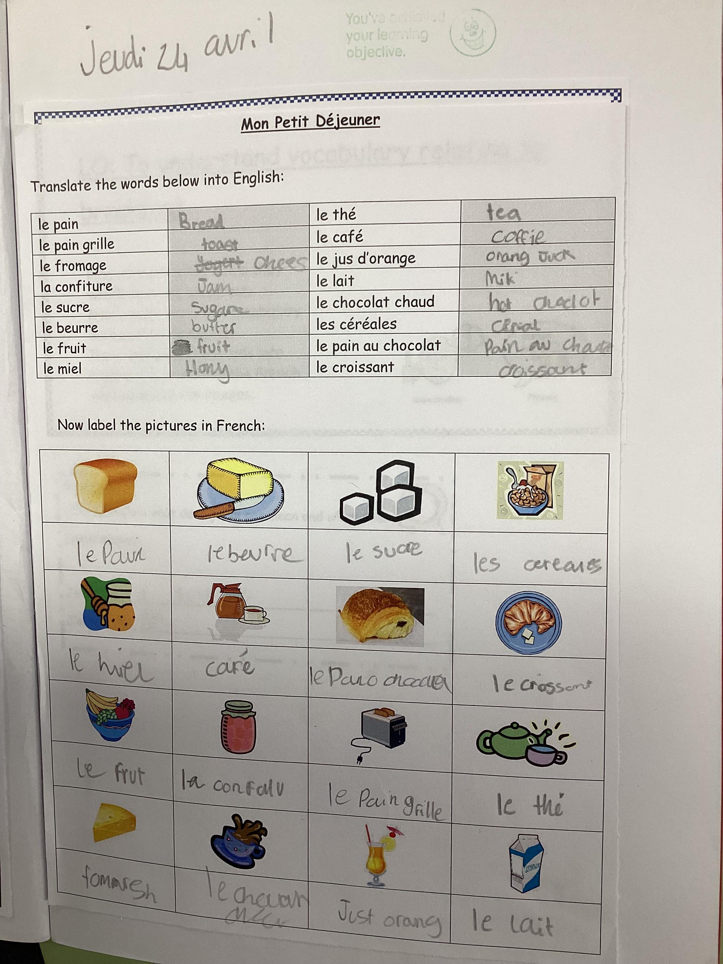 Today, we have retrieved French breakfast items before we have shared which items we like and which we do not like. Then we have written these sentences in French. We really enjoyed this as we could test our friends to make sure they were listening.