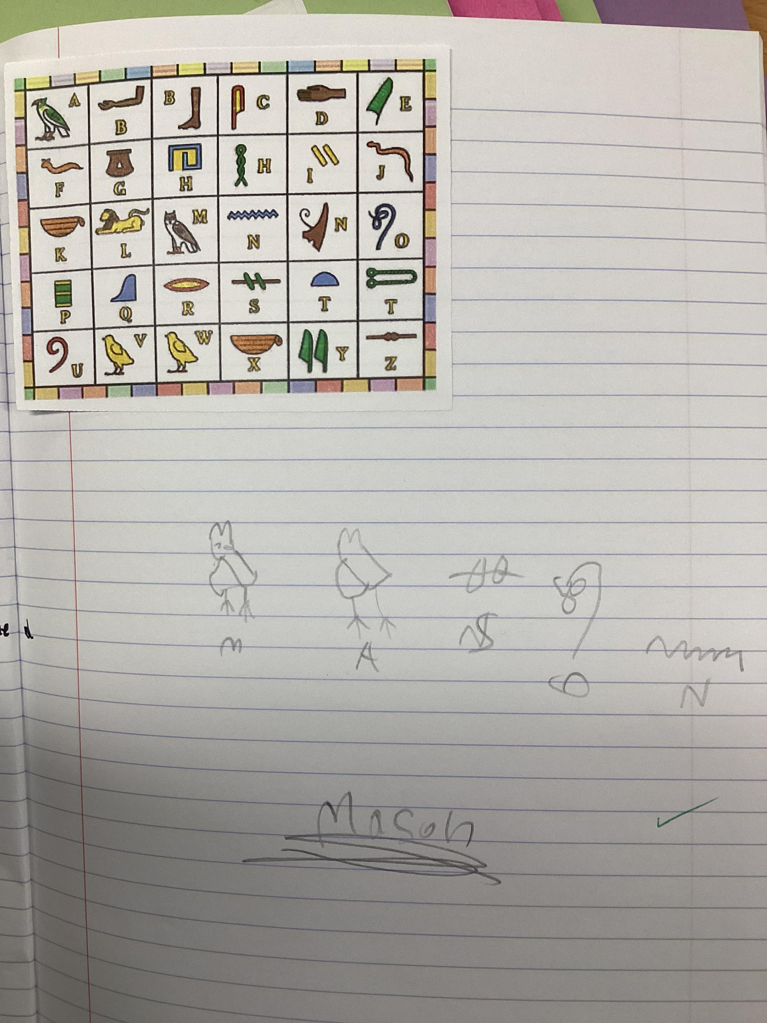 In our 2nd lesson, we focused on Egyptian art and compared these to other examples of art from other time periods. We tried to decipher what we think they mean. We then started to look at hieroglyphics which is how the Egyptians communicated through writing. We really enjoyed trying to spell our name in hieroglyphics.