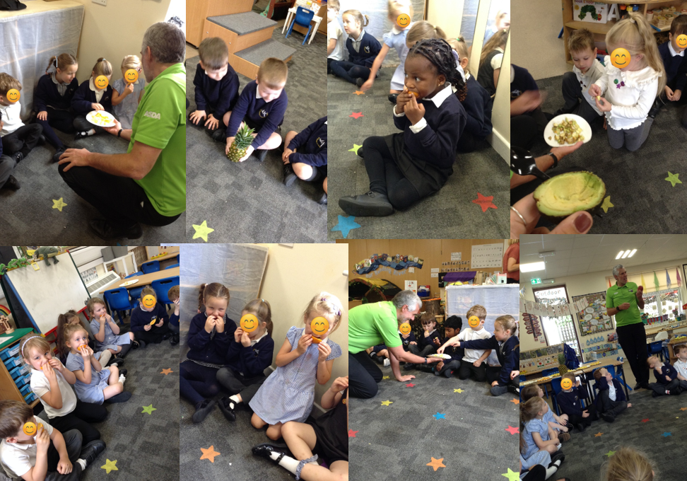 Joy class had a visit from Asda Steve, who brought with him a selection of the fruits from Handa's Surprise story. The children each got to try a piece of banana, avocado, tangerine, passion fruit, mango and some pineapple. The children used their senses to describe the feel, look, smell and taste of the different foods.