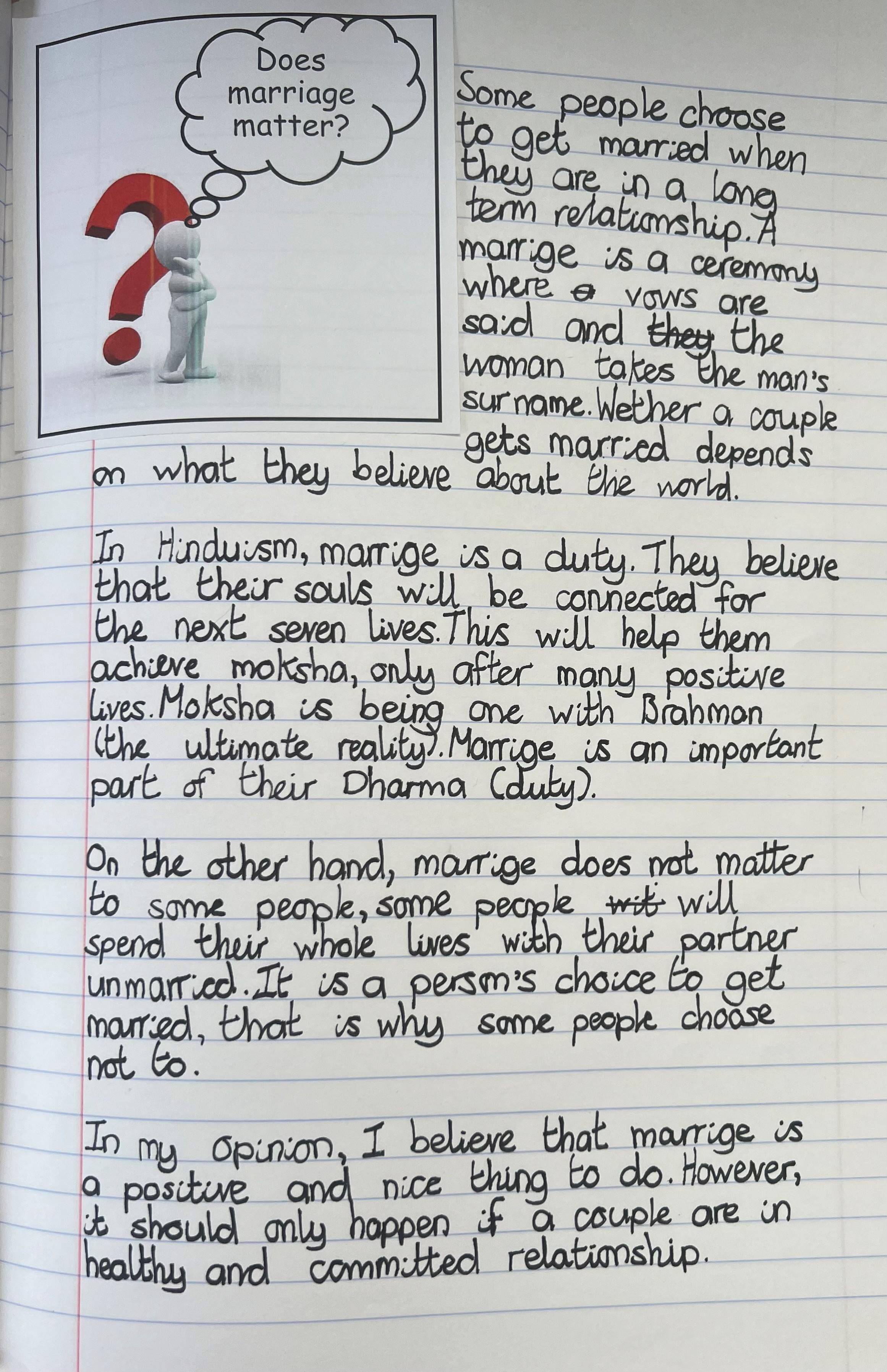 Building upon the learning of rites of passage for birth and initiation last term, we will be looking at the rites of passage for marriage and death for Christians, Hindus, Jews and Muslims. Our understanding of the different people’s beliefs -who live in our community- is an important part of each of us becoming religiously literate 21st century citizens. To start the unit the children have written a balanced argument as to whether marriage is a good thing or not.